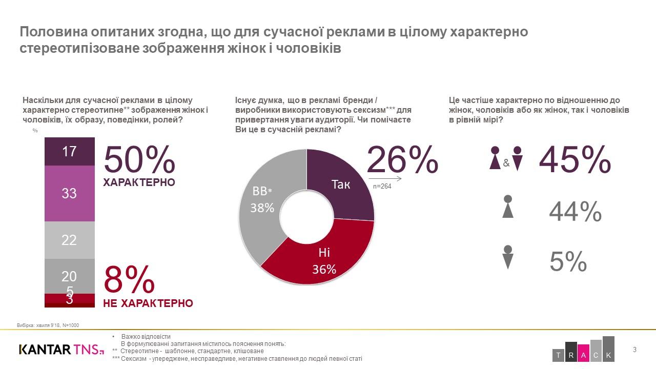 По данным исследований Kantar TNS Online Track, половина опрошенных согласна, что для современной рекламы в целом характерно стереотипное изображение женщин и мужчин (50%). Нейтральную позицию занимают 22%, еще 20% затруднились ответить на вопрос.