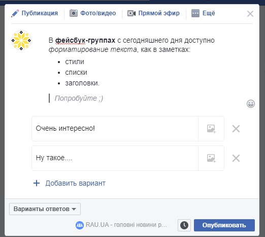 В группах Facebook появилась возможность форматировать текста, как в заметках. Теперь администраторы могут использовать стили, списки, заголовки. Инструменты доступны для всех типов групп (не путать со страницами, – прим.).
