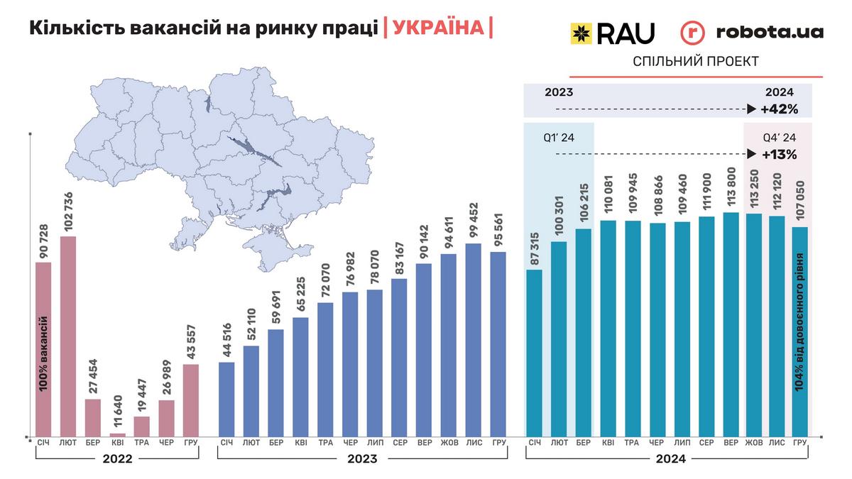 Эксперты robota.ua отмечают рост вакансий. По итогам 2024 года количество вакансий больше на 4% от довоенного уровня. Хотя прогнозируется, что в ближайшие годы темпы роста замедлятся. Начиная с апреля количество вакантных рабочих мест стабилизировалось на отметке около 110 000. Осенью был дополнительный небольшой всплеск спроса на кадры, достигнув пика в сентябре – почти 114 000 вакансий. В целом число вакансий в IV квартале прошлого года было больше на 13%, чем в первом, а по сравнению с показателями 2023 года среднее количество вакансий в 2024-м было выше на 42%.
