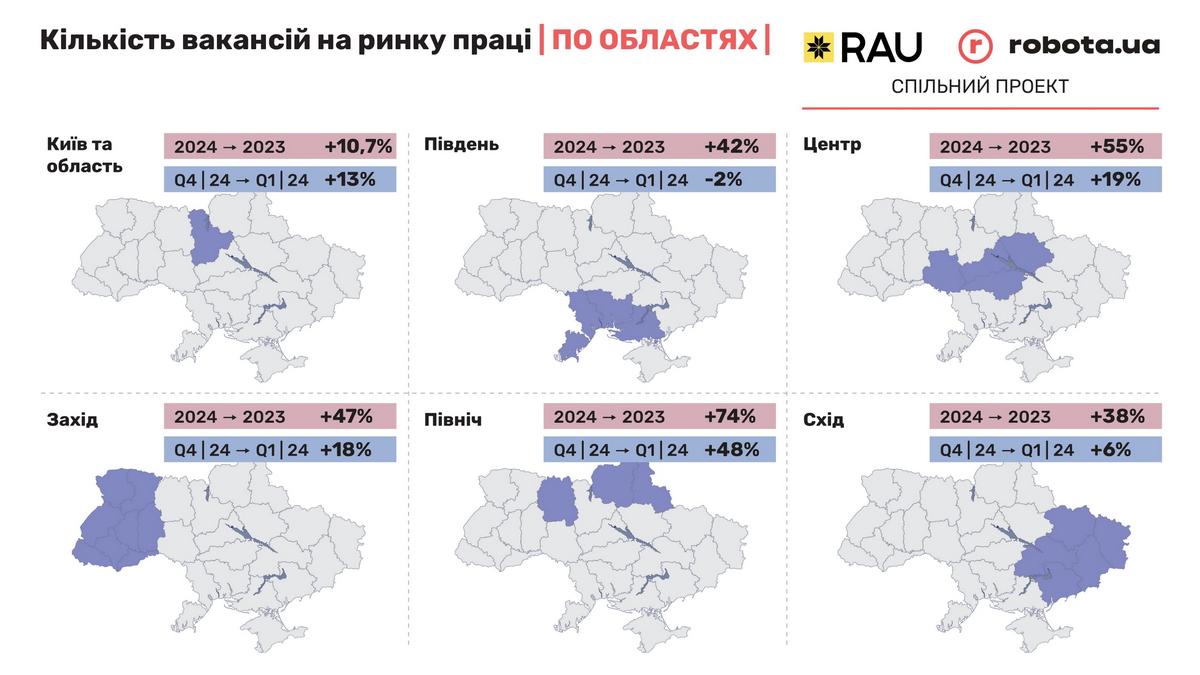 В региональном разрезе наибольший прирост из года в год фиксируется на севере Украины (74%). На втором месте центральный регион (без учета Киева и области) с приростом в 55% имеющихся рабочих мест в 2024 году по сравнению с 2023 годом. Третье место занимает запад страны (+47%). В целом все регионы приросли более чем на 35% год к году. Киев и область исторически являются крупнейшим центром вакансий, поэтому относительный прирост не так заметен: за январь-декабрь 2024 года количество вакансий здесь увеличилось на 10,7% по сравнению с 2023-м.