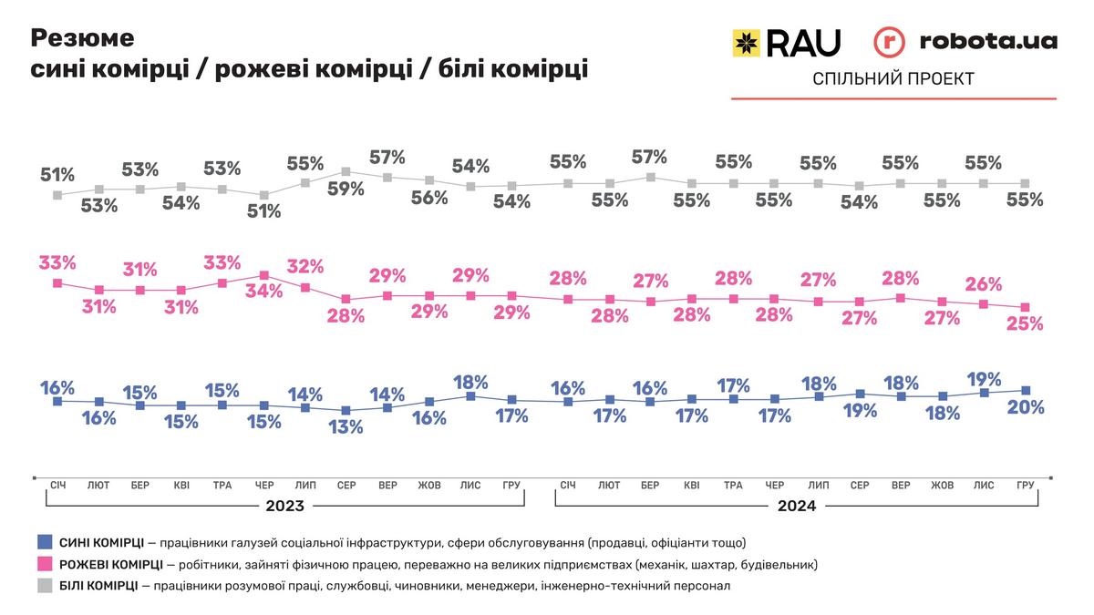 По соотношению белых, розовых и синих воротничков (работники сферы обслуживания – продавцы, официанты и т.п.) сейчас преобладают белые. То есть, работники умственного труда, служащие, чиновники, менеджеры, инженерно-технический персонал. Доля таких резюме за последние два года не опускалась ниже 51%.