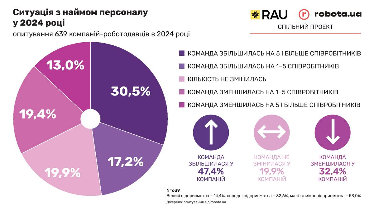 В результате за 2024 год почти половина опрошенных компаний (47,7%) смогли расширить команды, около 20% сохранили существующий коллектив и только треть – сократили количество работников. Здесь следует отметить, что большая часть (53%) опрошенных компаний – это малые предприятия, а треть являются представителями среднего бизнеса.