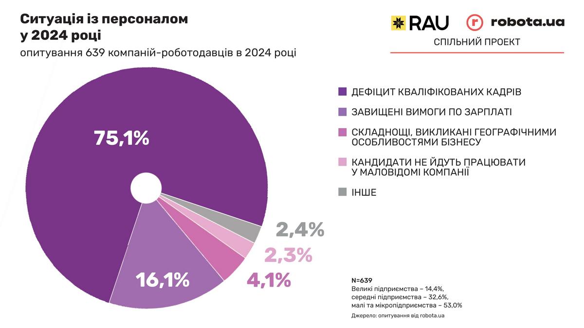 Ни для кого не секрет существующий дефицит квалифицированных сотрудников практически во всех отраслях украинской экономики. Что лишний раз подтвердил опрос бизнеса – 75,1% компаний не могут найти опытных кадров. Причем только 16% людей не хватает из-за их завышенных зарплатных ожиданий. Также географические особенности бизнеса мешают нанять персонал только в 4% случаев.
