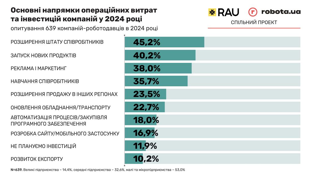 Несмотря на эти трудности, более 40% украинского бизнеса в 2024 году было настроено на расширение штата и запуск новых продуктов. Среди основных направлений инвестирования были реклама и маркетинг, обучение сотрудников и расширение географии продаж. Приблизительно пятая часть опрошенных компаний вкладывалась в цифровизацию и автоматизацию.