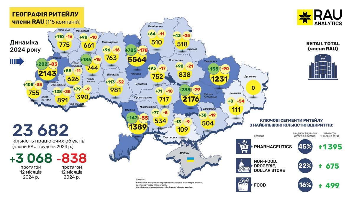 Как показал регулярный ежемесячный опрос RAU, проведенный среди 115 членов Ассоциации ритейлеров, по состоянию на декабрь 2024 года у них работало уже 23 682 торговых точки в восьми основных отраслях ритейла. За этот период чистый прирост составил 2230 торговых объектов. На первых местах по количеству открытых точек находятся аптечный ритейл с долей новых локаций в 45% всех новых магазинов, непродовольственная розница (22%) и продуктовые магазины (16%).