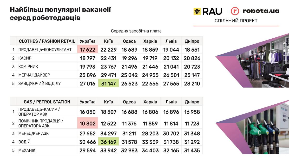 В топливном ритейле минимальные ставки зафиксировало у помощника продавца/оператора АЗК, которым в среднем предлагали 10 802 грн. Что почти на 6000 грн меньше средней ставки собственно продавца/оператора АЗК. Интересно, что больше всего работодатели готовы были платить механикам в Харькове (34 403 грн), а не в столице. Так же профессия водителя в Киеве оплачивалась топливными операторами даже ниже, чем в среднем по стране – 26 169 грн против 30 466 грн соответственно. По идее, большая оплата в прифронтовом Харькове является определенной компенсацией за больший риск.