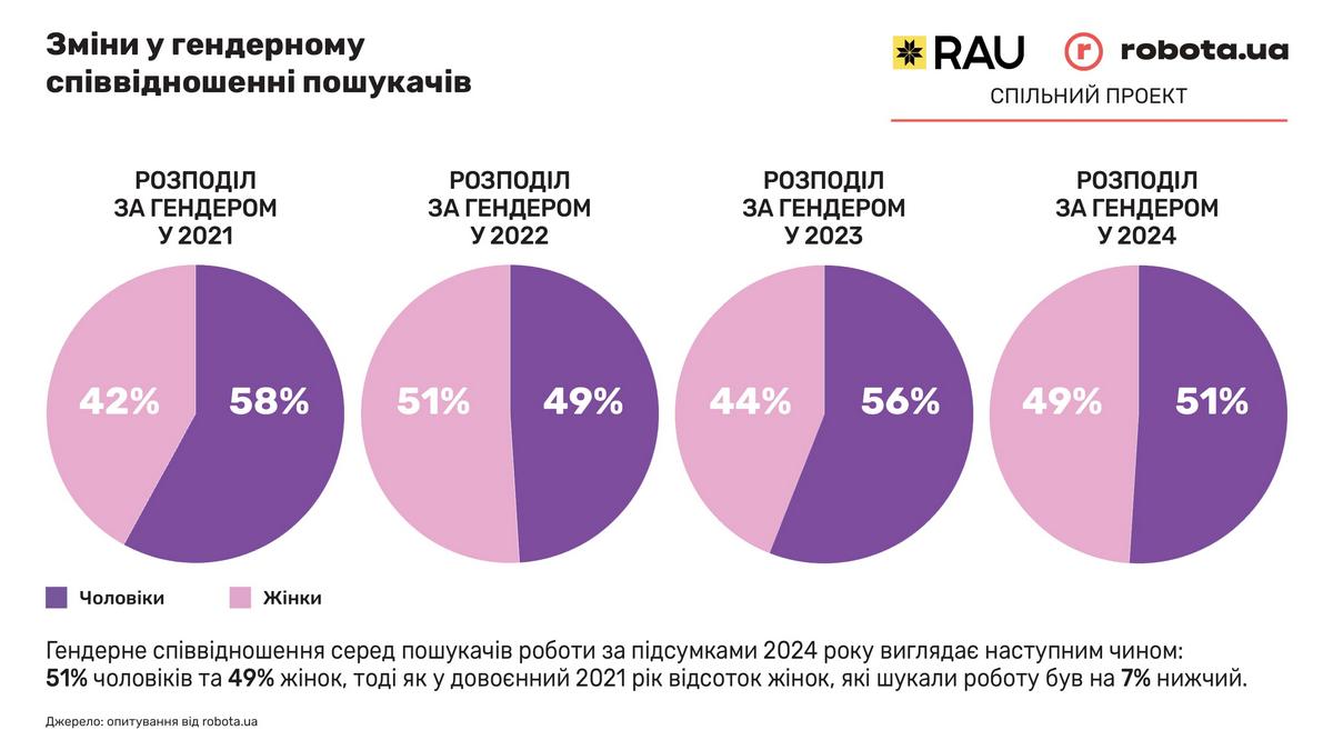 Война повлияла не только на размеры зарплат, но и распределение по гендерному признаку как существующих работников в компании, так и тех, кого берут на работу. Так, если в 2021 году искали работу 58% мужчин и 42% женщин, то за три года войны эта пропорция почти сравнялась с 51% на 49%.