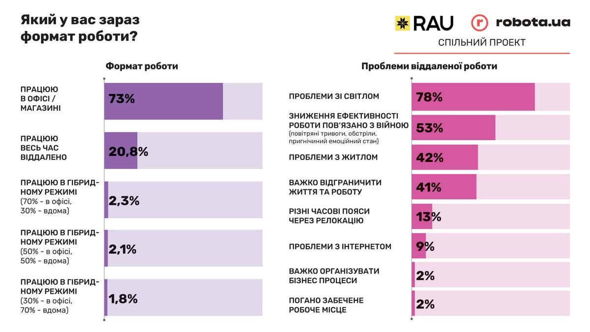 Хотя большинство респондентов опроса указали, что работают оффлайн, более 20% все же имеют дистанционную работу. Самая большая сложность сейчас в таком формате — проблемы с электроэнергией, требующие настроек автономного home office и, соответственно, привлечения к этому дополнительных средств.