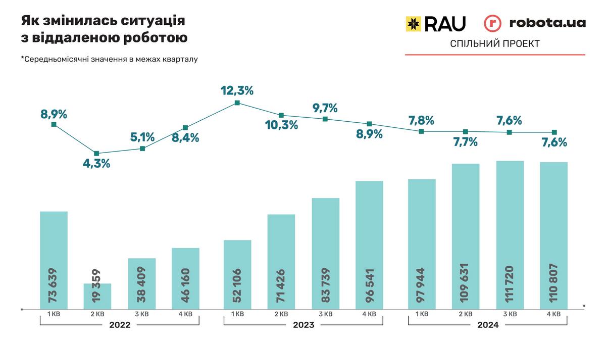 Если рассмотреть этот процесс в динамике, можно заметить всплеск количества вакансий с дистанционной работой в конце 2022-го и начале 2023 года, когда в результате атак на энергетическую инфраструктуру Украины многие были вынуждены работать дома, в кафе или коворкингах. Со временем количество таких вакансий постепенно уменьшалось до доли в 7,6%.