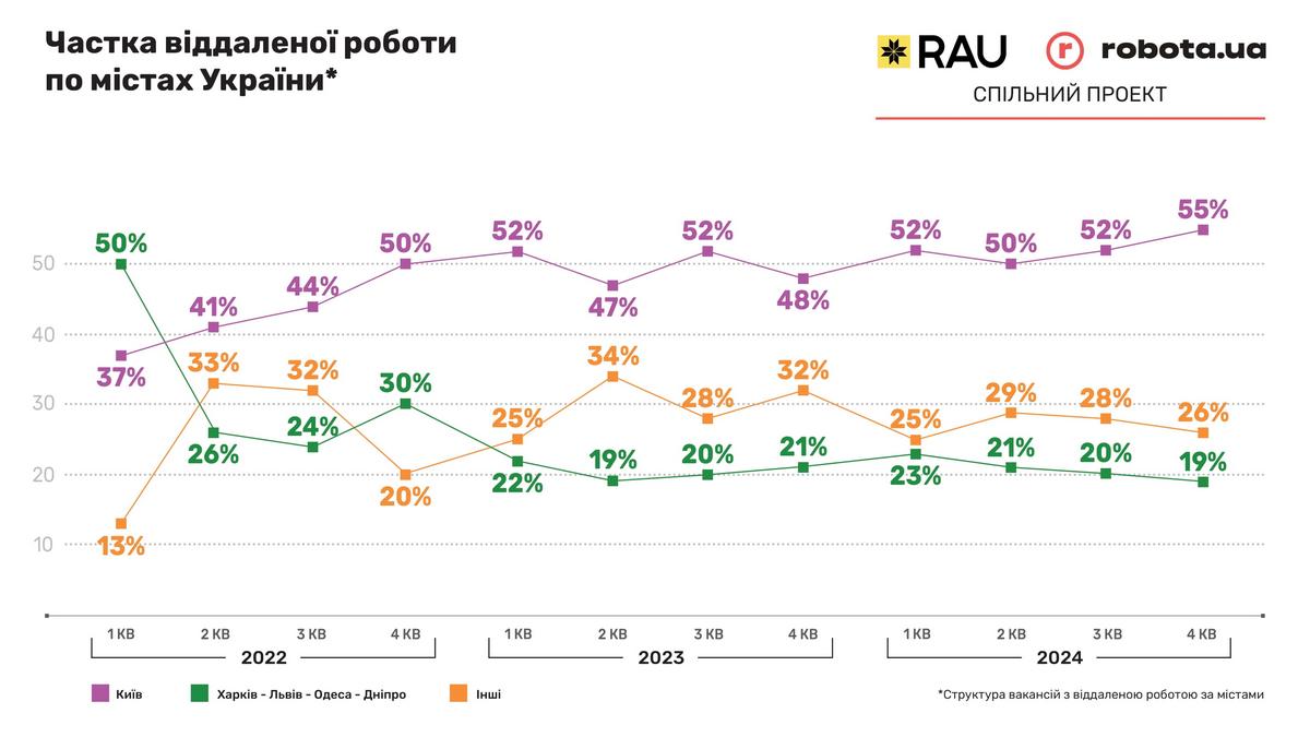 Интересно также, что больше возможностей найти отдаленную работу остается в столице. С начала полномасштабного вторжения в Киеве наблюдается постепенное увеличение доли вакансий с дистанционной работой. В настоящее время здесь сосредоточено 55% всех подобных предложений по Украине. В то же время в других городах-миллионниках (Харьков, Днепр, Одесса, Львов) количество таких вакансий постепенно сократилось с 50% до 19%.