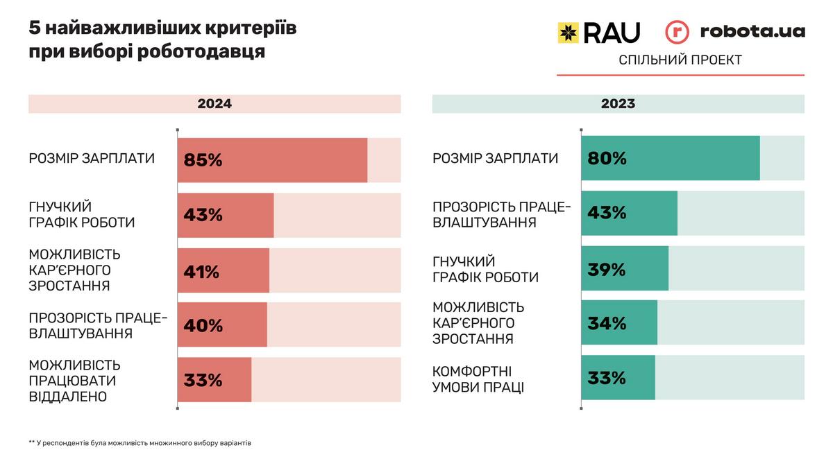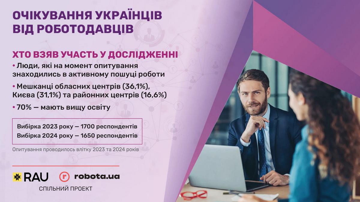 Очередной опрос, проведенный среди 1650 респондентов, находящихся в активном поиске работы, показал, чего ожидают украинцы от своих работодателей. Отметим, что это преимущественно люди с высшим образованием, проживающие либо в столице, либо в областных центрах. Аналогичный опрос 2023 охватил 1700 респондентов.