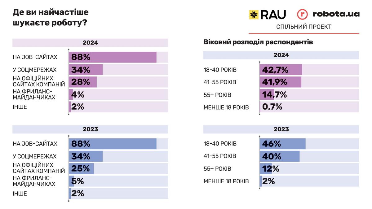 Большинство опрошенных (88%) искали работу в 2023-24 годах как на специализированных сайтах, так и в социальных сетях (34%). В прошлом году несколько увеличилось количество тех, кто заходит на официальные сайты компаний (28%). А вот количество молодых людей до 18 лет, желающих найти работу, упало с 2% до размера погрешности (0,7%). Это может быть связано с возможностью мужчин моложе 18 уехать за границу на обучение или работу. Зато увеличилось количество соискателей старше 55 лет.