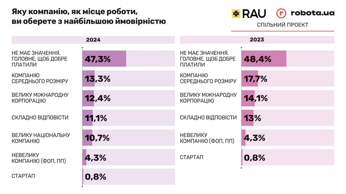 Практически неизменными оказались критерии выбора компании, в которой предпочли бы работать украинцы. Единственное отличие – готовность работать в крупной национальной компании.