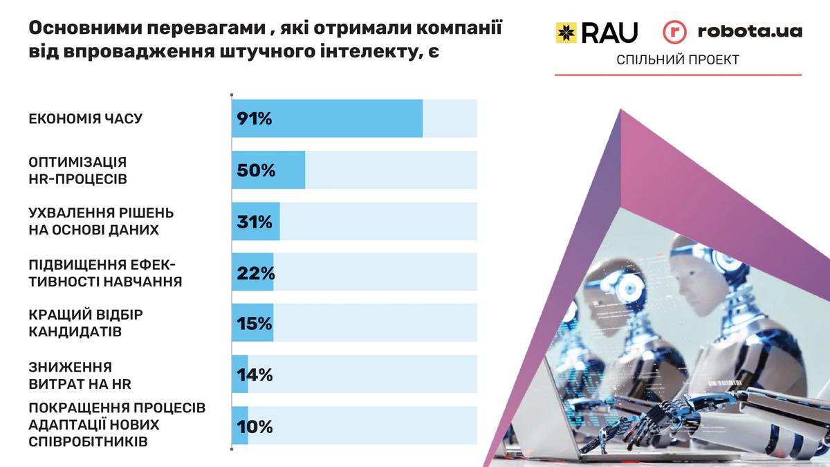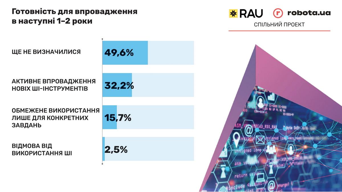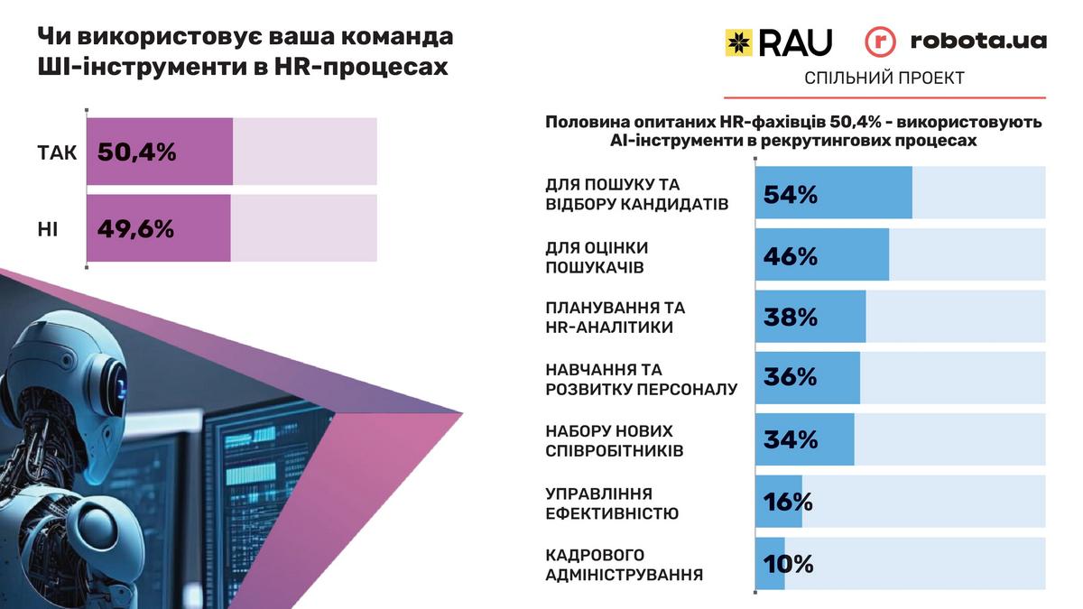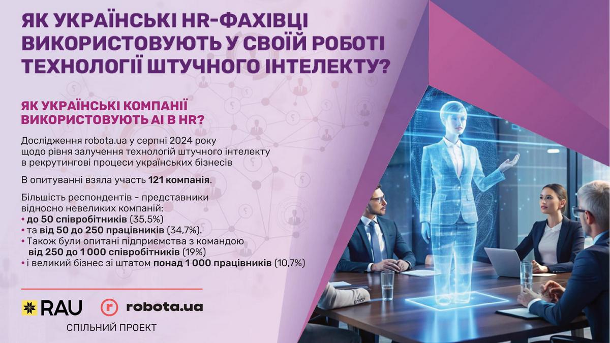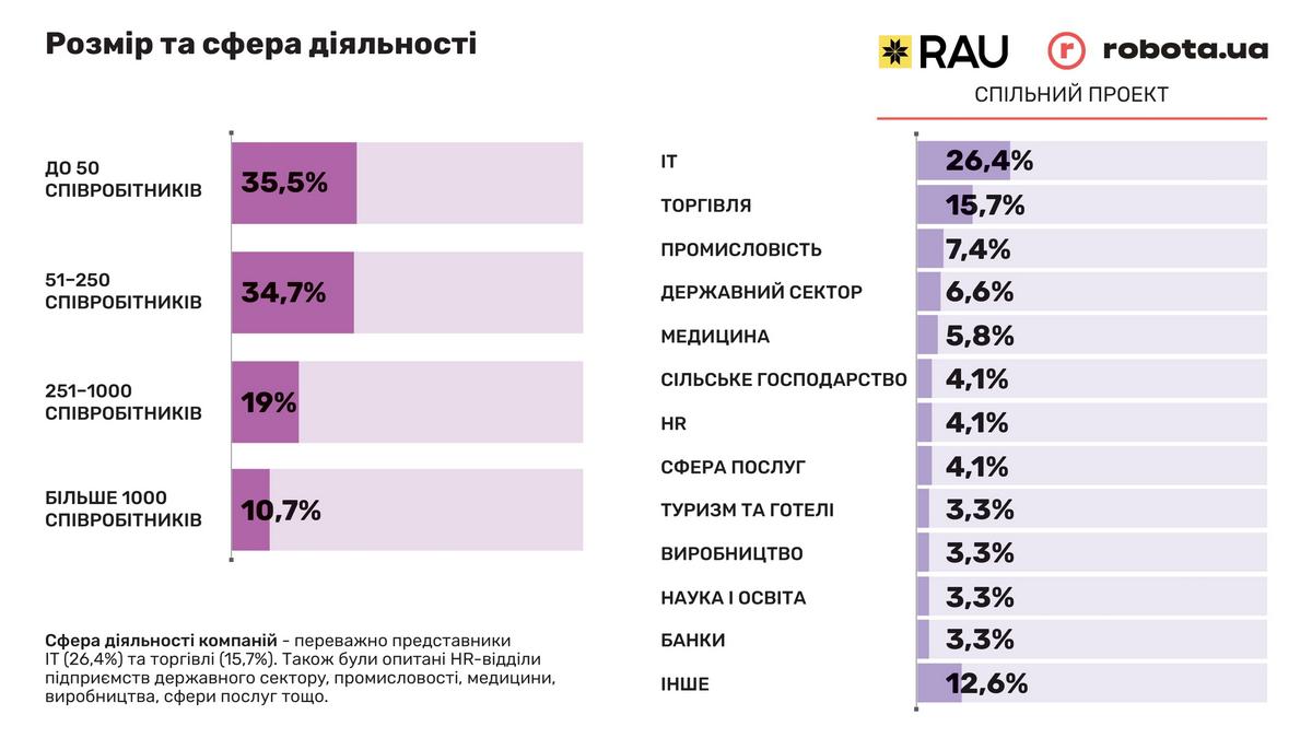 В августе 2024 года robota.ua провела исследование среди 121 компании по уровню привлечения технологий искусственного интеллекта в рекрутинговые процессы. Большинство респондентов – представители относительно небольших компаний со штатом до 50 сотрудников (35,5%) и от 50 до 250 работников (34,7%). Также были опрошены средние и крупные предприятия.