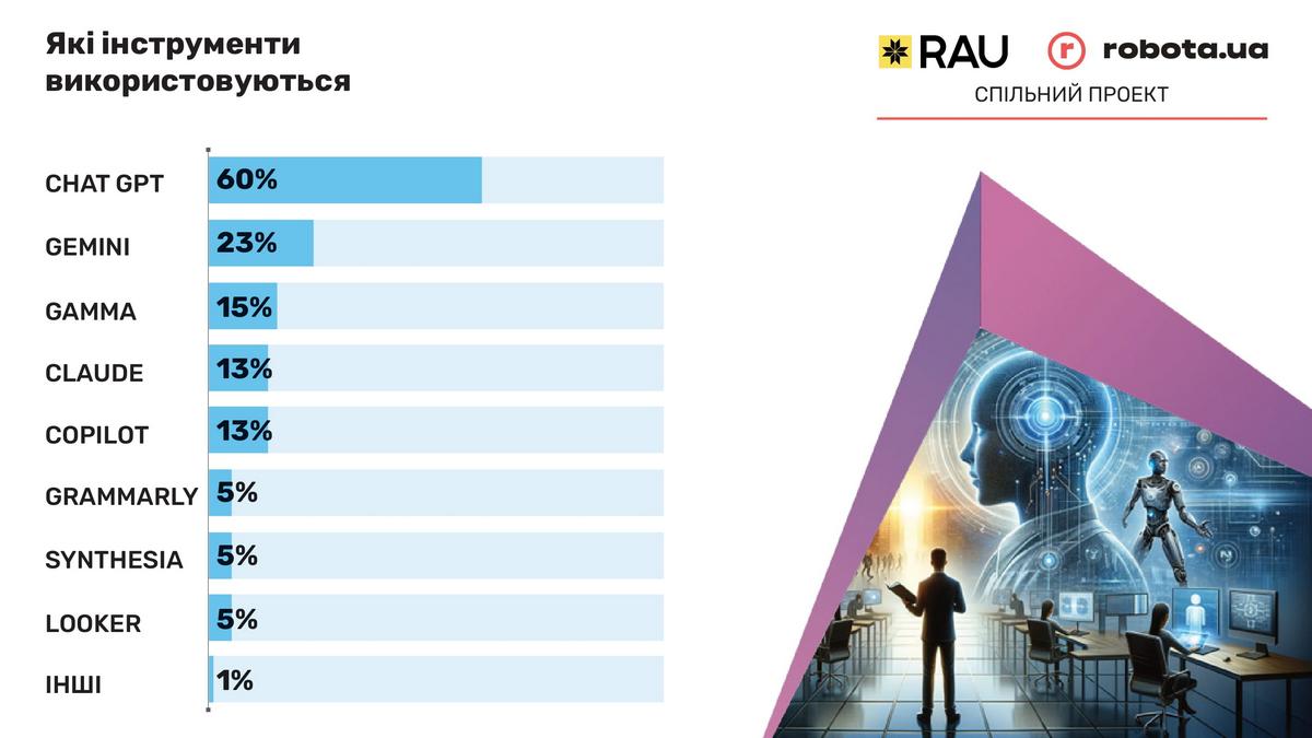 Среди имеющихся инструментов ИИ чаще всего используется Chat GPT (60%) и Gemini (23%)