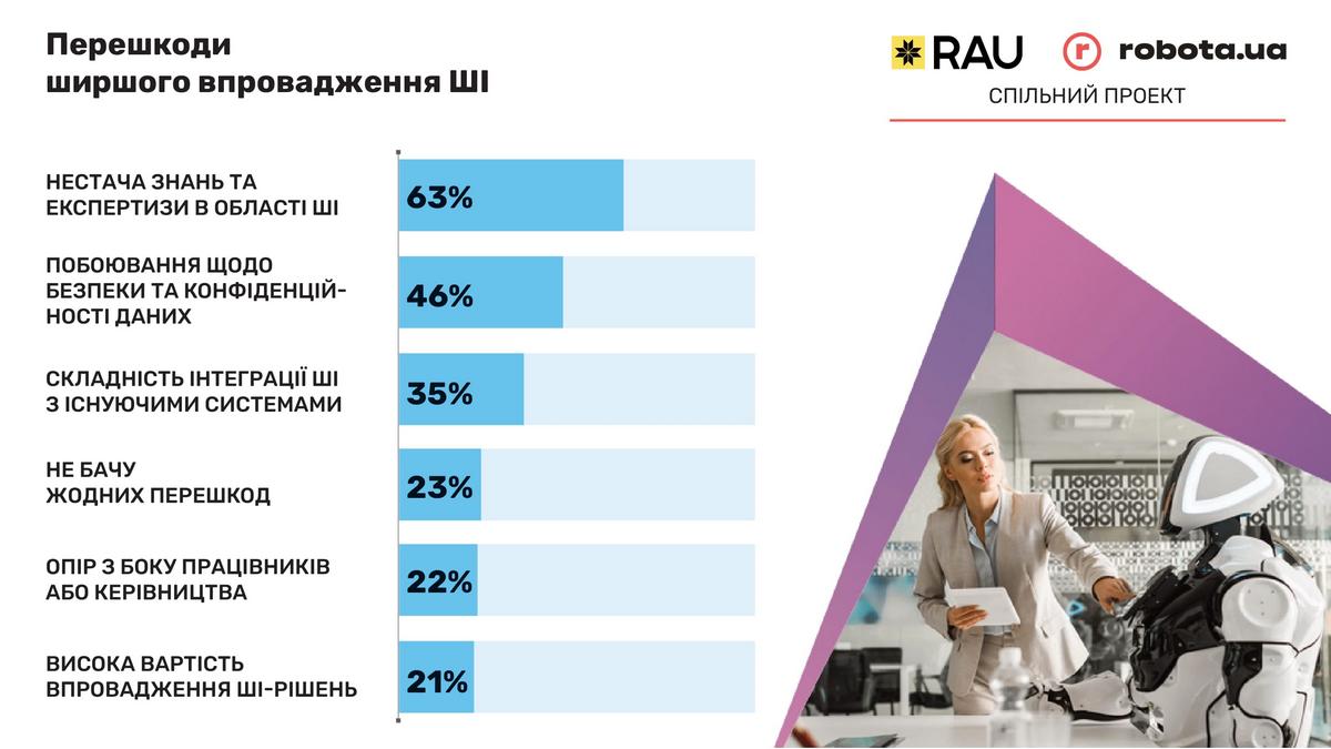 Главное препятствие на пути улучшения кадровой работы – это недостаток экспертизы в области применения инструментов искусственного интеллекта. Об этом заявили 63% опрошенных компаний. Опасения касательно безопасности и конфиденциальности данных (46%), которые будут использовать в работе ИИ, являются еще одним важным фактором торможения технического прогресса. Среди технических и организационных вопросов компании называют сложность интеграции ИИ с существующими системами, сопротивление со стороны работников и высокую стоимость внедрения.