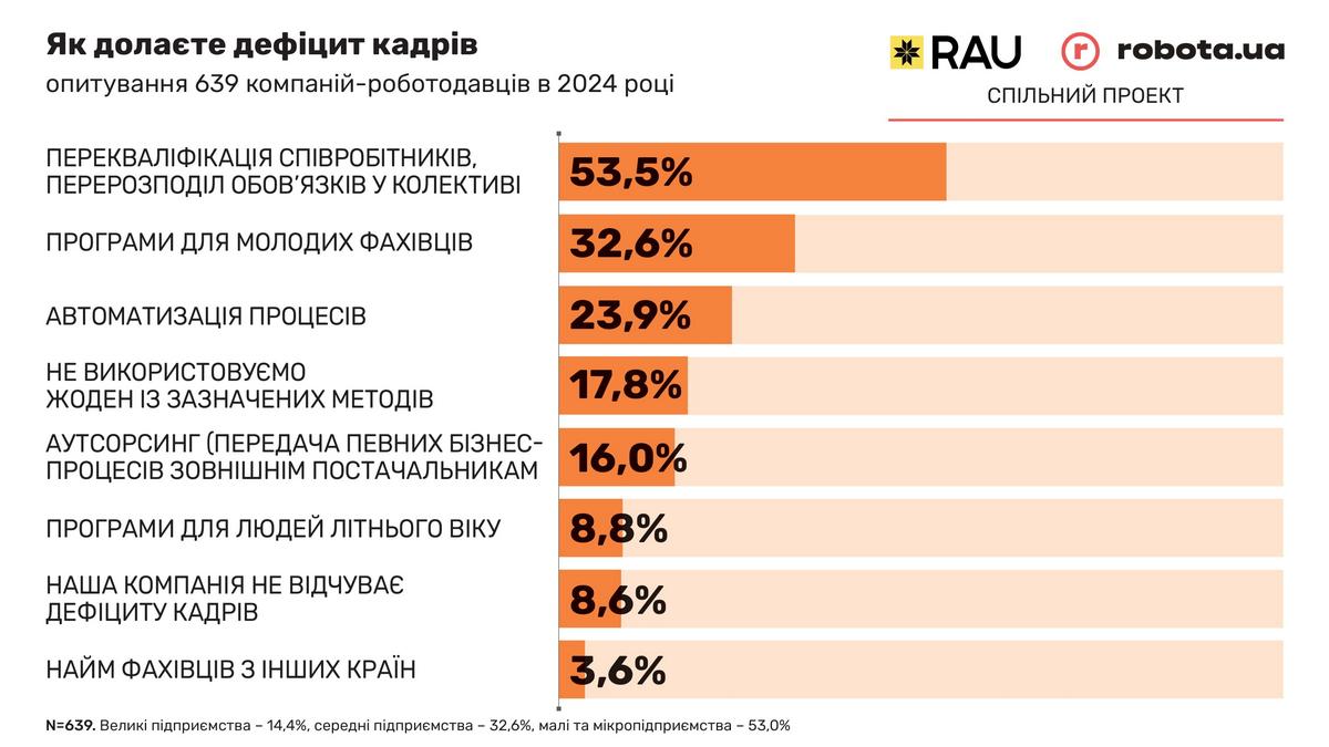 Поэтому компании закрывают дефицит в основном за счет переквалификации существующих кадров и перераспределения их функционала – почти 54%. Не более трети вакансий помогают закрыть программы для молодых специалистов и только 23,9% компаний смогли в прошлом году преодолеть дефицит определенных кадров за счет автоматизации бизнес-процессов. Интересно, что не испытывает нехватки специалистов менее 9% компаний.