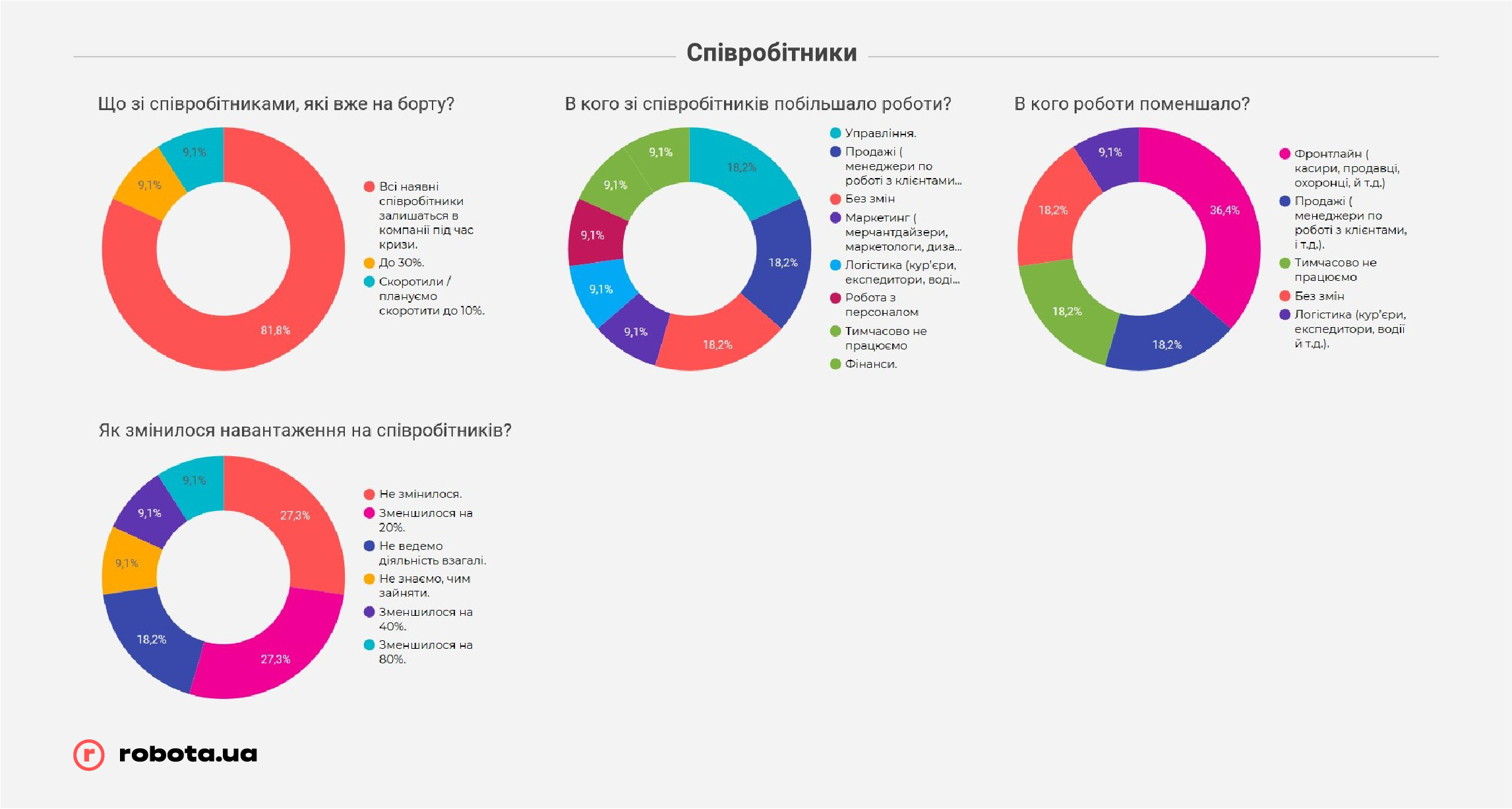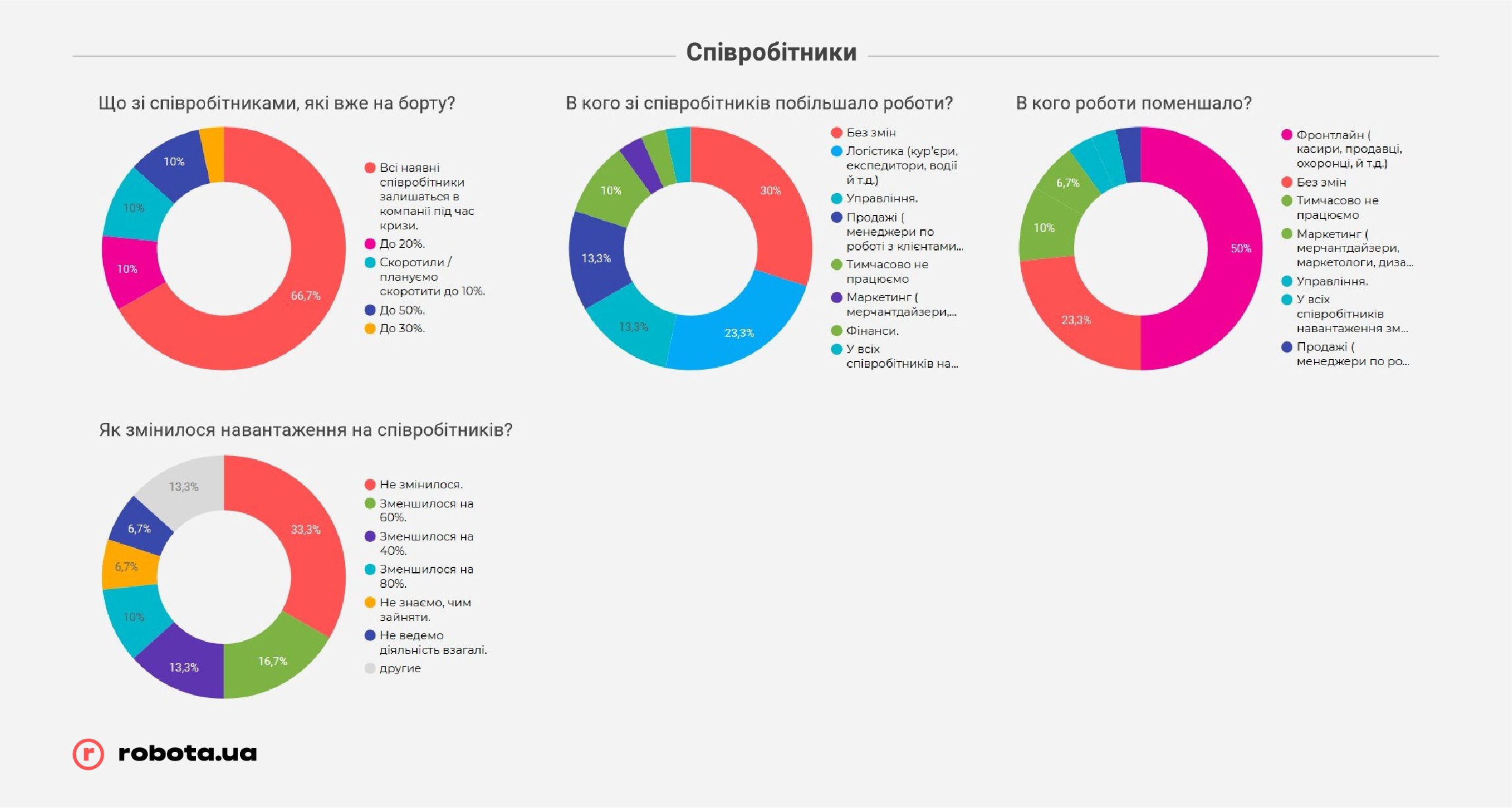 Редакция портала Ассоциации ритейлеров Украины и первая онлайн-платформа по поиску работы в Украине robota.ua презентуют совместный спецпроект: как изменился рынок труда в сфере розничной торговли с начала карантина. Специалисты robota.ua проанализировали изменения в количестве резюме и вакансий в ритейле в целом, и в подсегментах отрасли отдельно, выяснили, как оценивают нынешнюю ситуацию на рынке труда работодатели и соискатели, как изменились предлагаемые и запрашиваемые зарплаты, и многое другое. Всего в анкетировании приняли участие 306 компаний всех размеров: от малого бизнеса (менее 20-ти сотрудников) до больших розничных сетей, обеспечивающих работой 500 и больше украинцев. Полученная информация дает представление, что и как поменялось на рынке труда, какие шаги предприняли ритейлеры, как оценивают ситуацию, к чему готовятся и что будут делать в ближайшем будущем.