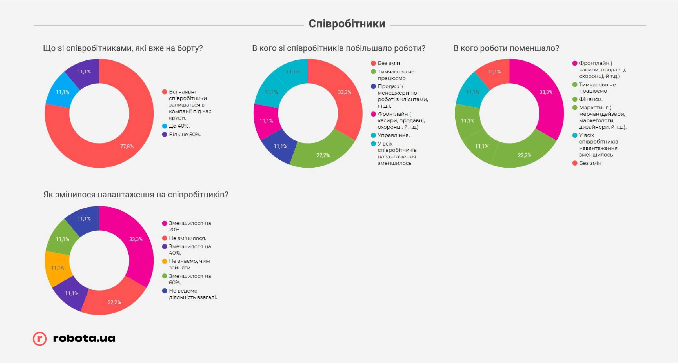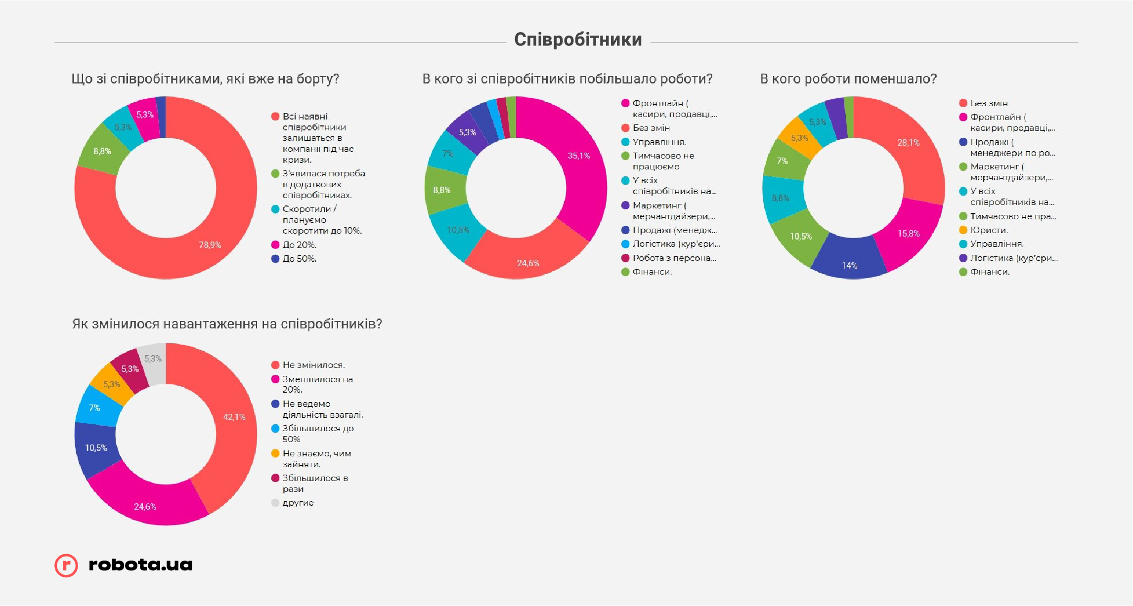 Еще одна особенность данного направления розничной торговли в Украине: почти 90% предприятий сохранили штат полностью или даже ищут новых сотрудников. И почти у половины компаний нагрузка на персонал осталась на прежнем уровне или увеличилась.