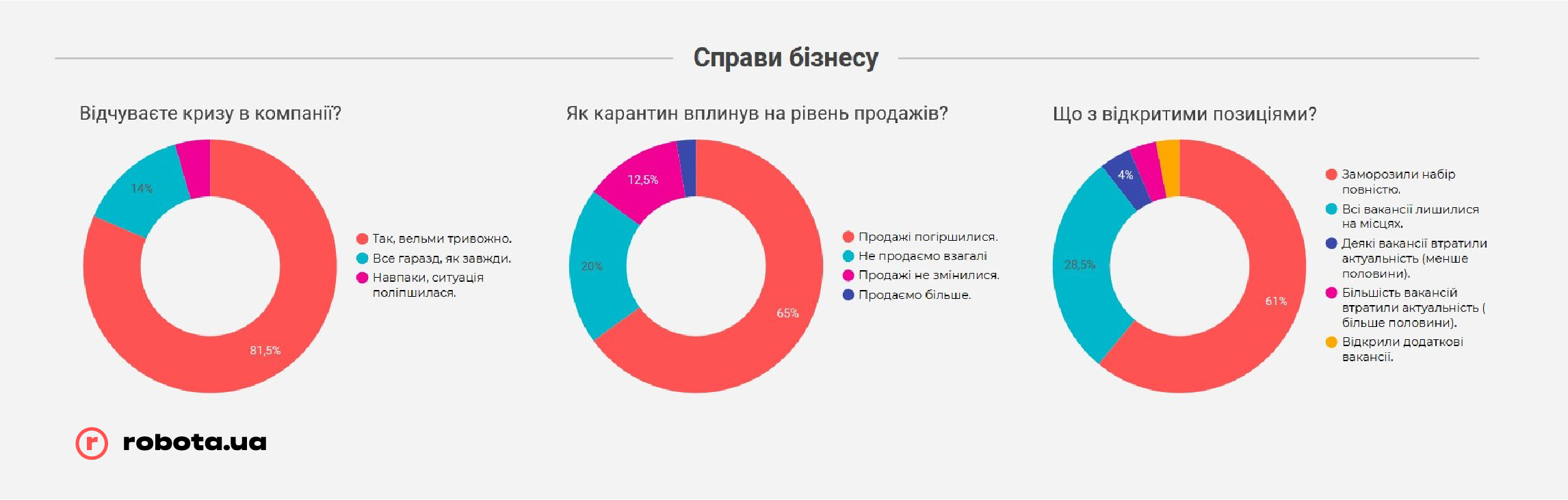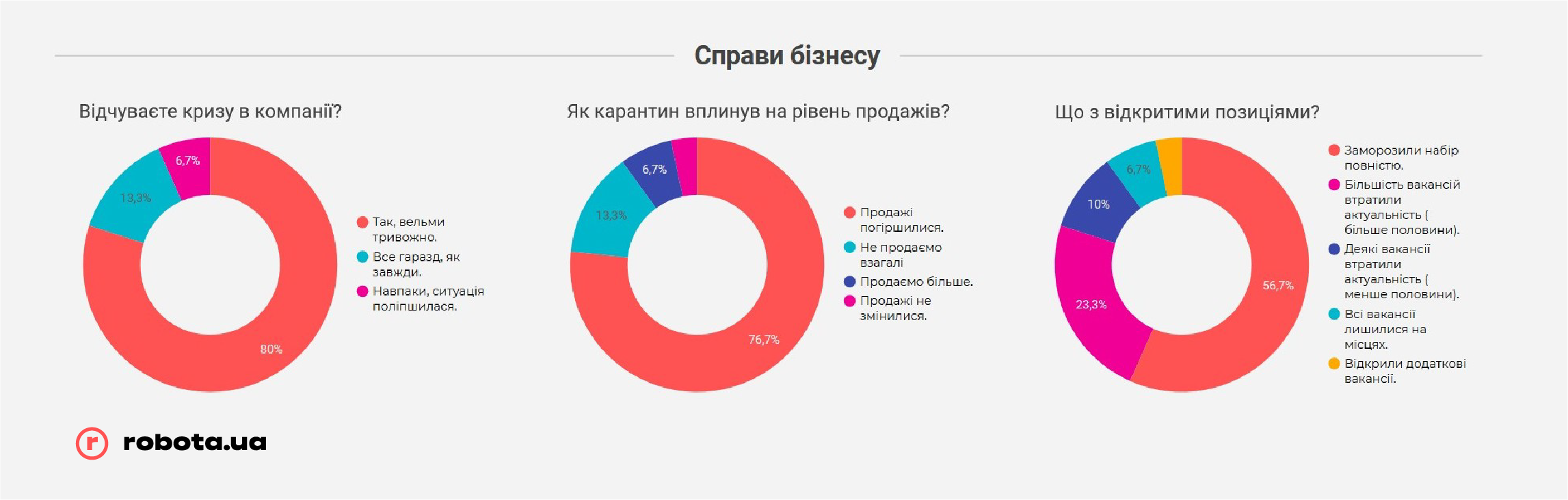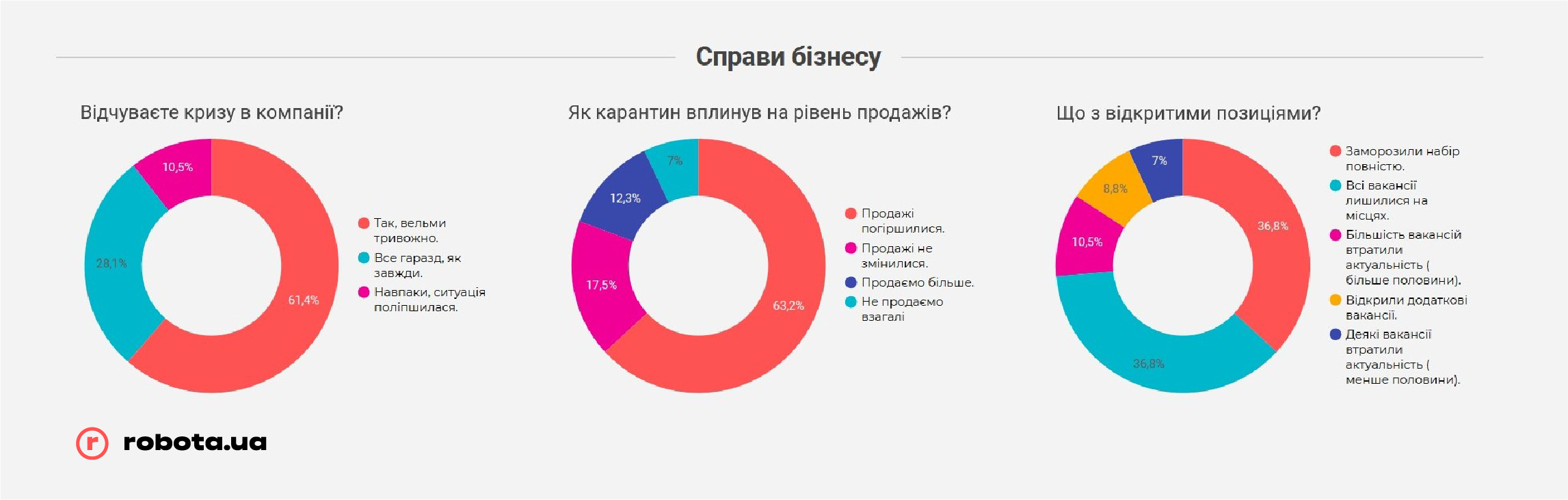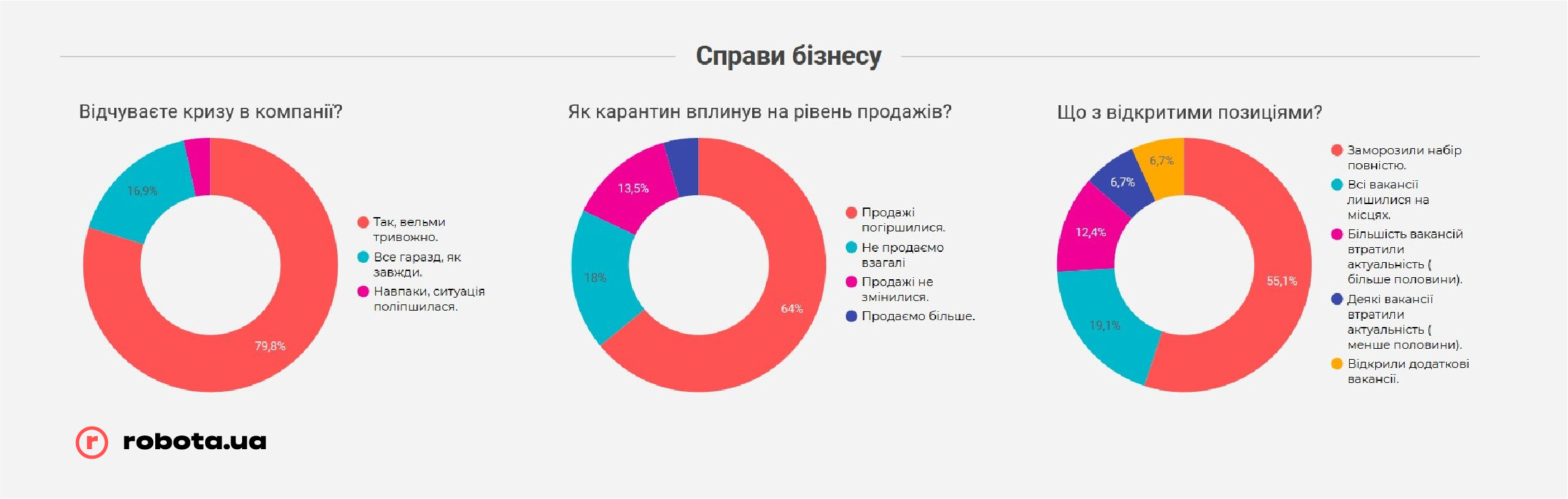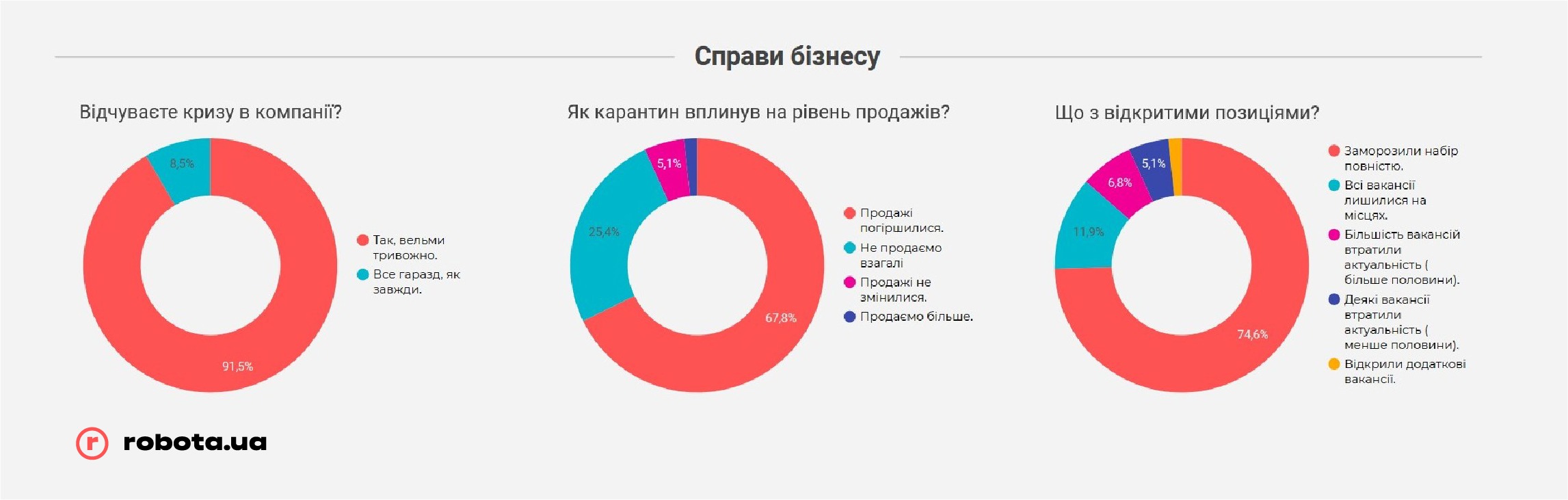 Но не стоит забывать, что robota.ua проводила опрос всего после первого месяца жестких ограничений ведения бизнеса. В случае, если карантин продлится дольше, чем до середины мая, показатели могут быть совсем другими, и гораздо более печальными. К этому времени «запас прочности» закончится у подавляющего большинства малых предприятий и значительной части среднего бизнеса, и тогда они будут вынуждены прибегать к массовым сокращениям, в том числе путем банкротства компаний, так как ресурсов на выплату заработных плат или иных платежей у них уже просто не хватит.
