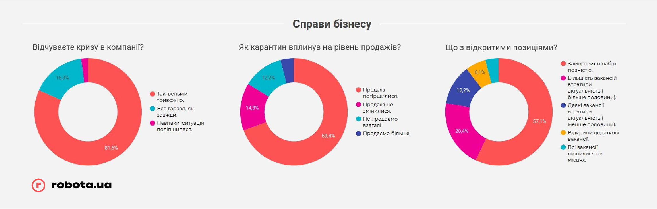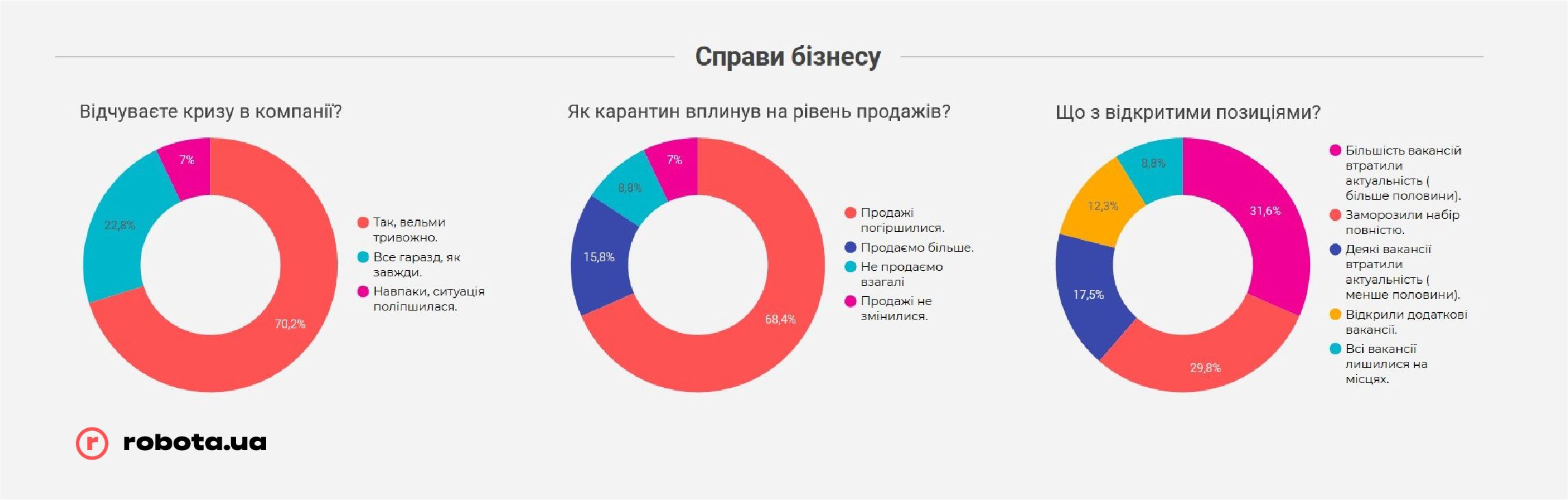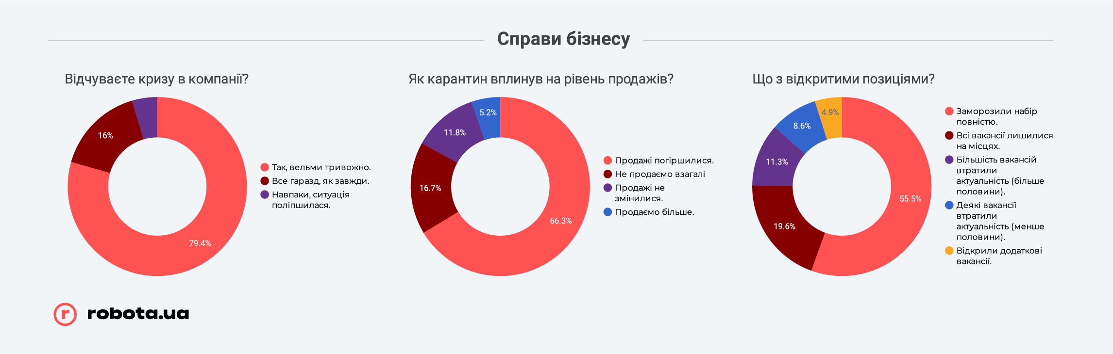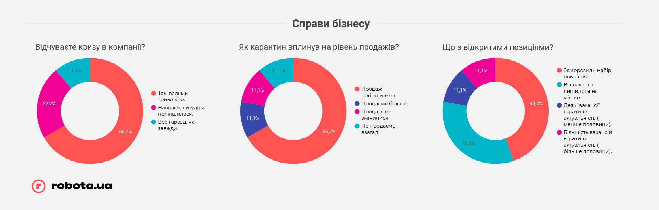 Но не стоит забывать, что robota.ua проводила опрос всего после первого месяца жестких ограничений ведения бизнеса. В случае, если карантин продлится дольше, чем до середины мая, показатели могут быть совсем другими, и гораздо более печальными. К этому времени «запас прочности» закончится у подавляющего большинства малых предприятий и значительной части среднего бизнеса, и тогда они будут вынуждены прибегать к массовым сокращениям, в том числе путем банкротства компаний, так как ресурсов на выплату заработных плат или иных платежей у них уже просто не хватит.