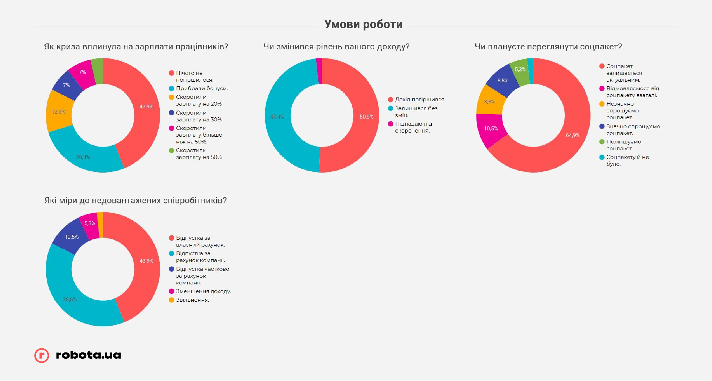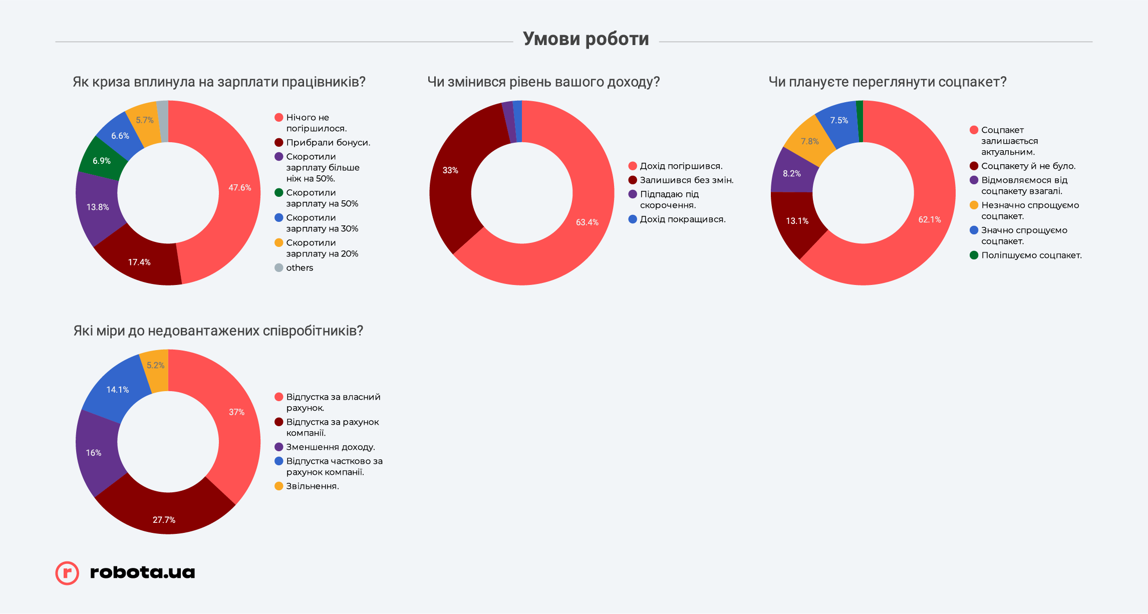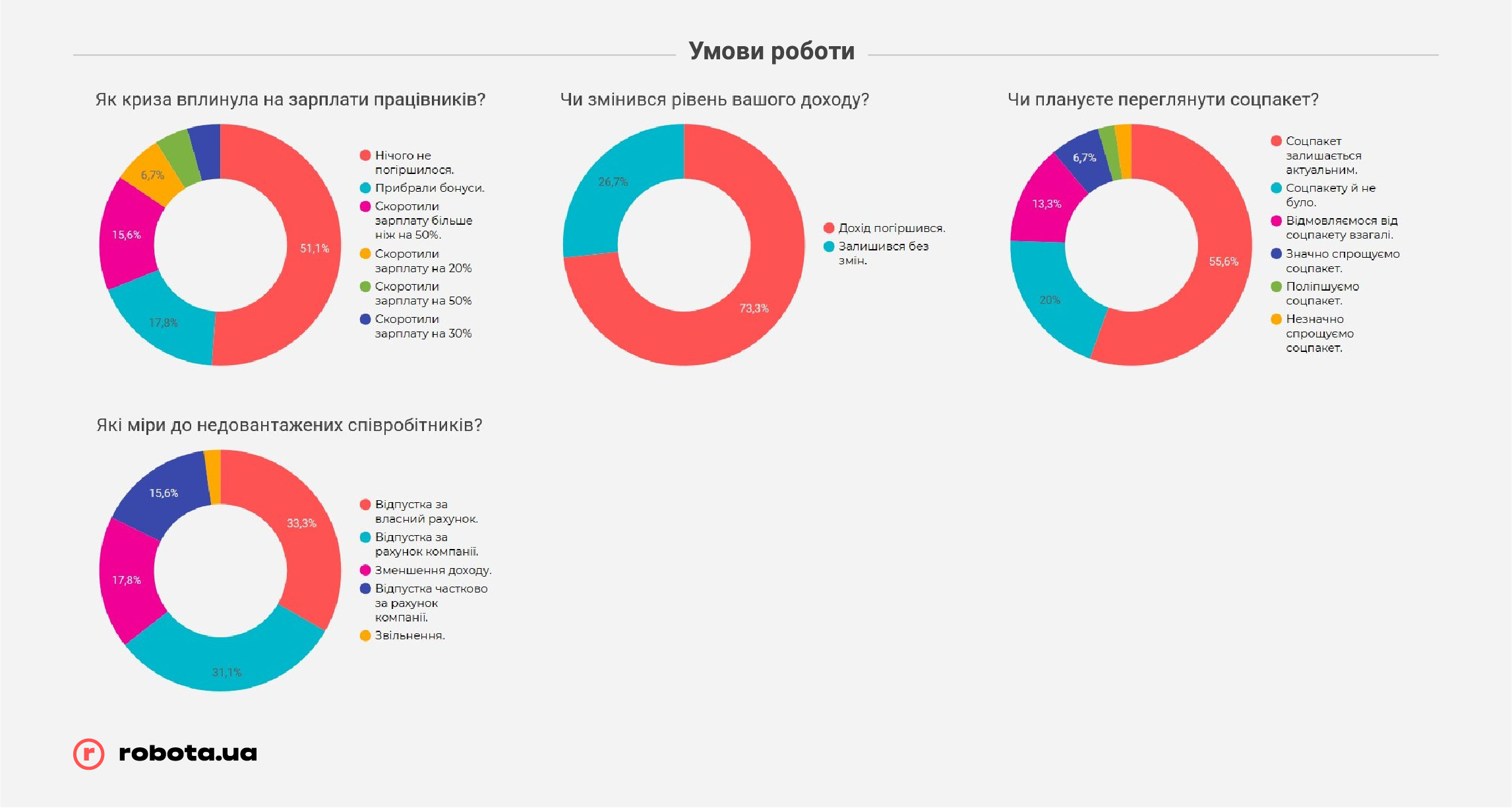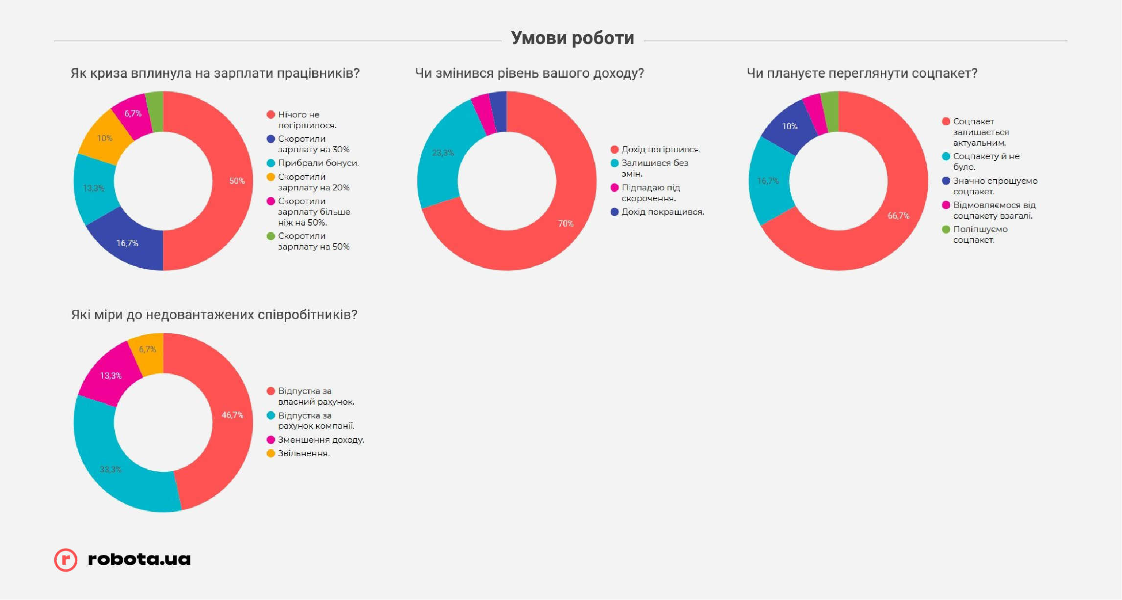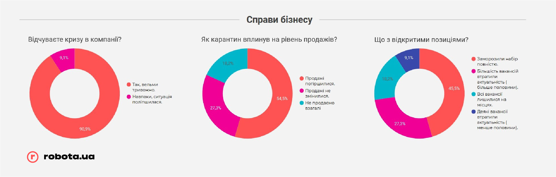 Но не стоит забывать, что robota.ua проводила опрос всего после первого месяца жестких ограничений ведения бизнеса. В случае, если карантин продлится дольше, чем до середины мая, показатели могут быть совсем другими, и гораздо более печальными. К этому времени «запас прочности» закончится у подавляющего большинства малых предприятий и значительной части среднего бизнеса, и тогда они будут вынуждены прибегать к массовым сокращениям, в том числе путем банкротства компаний, так как ресурсов на выплату заработных плат или иных платежей у них уже просто не хватит.