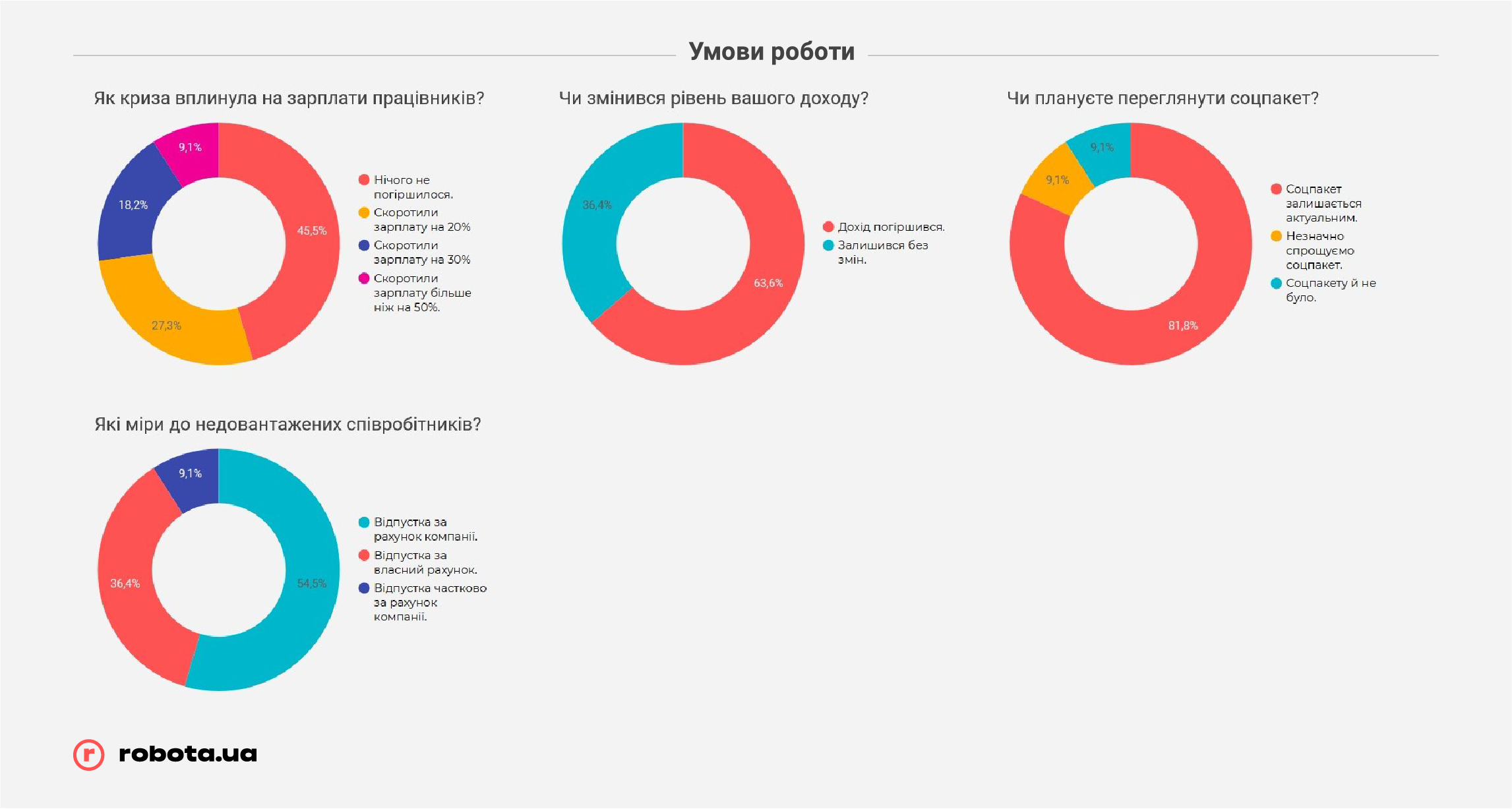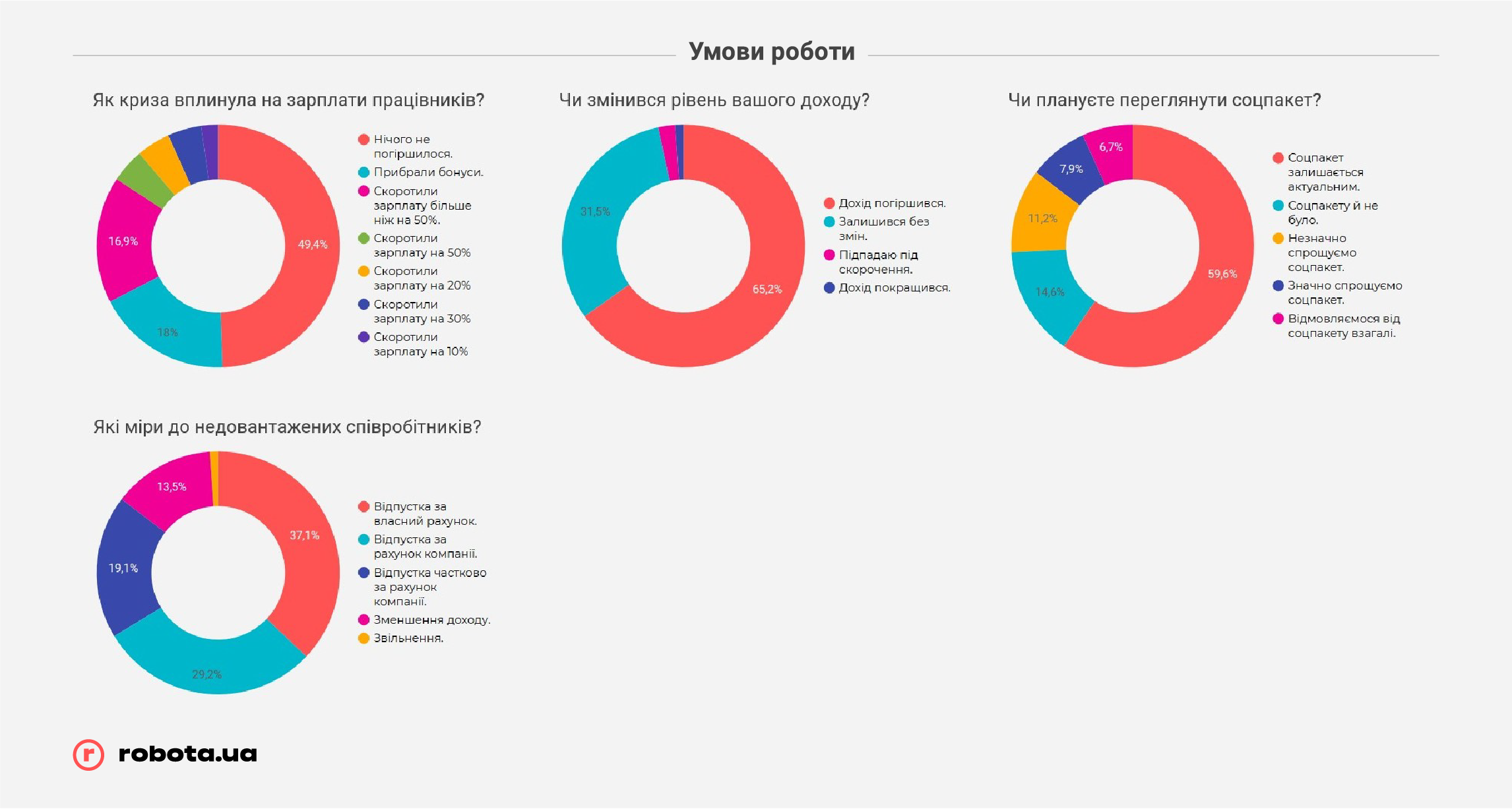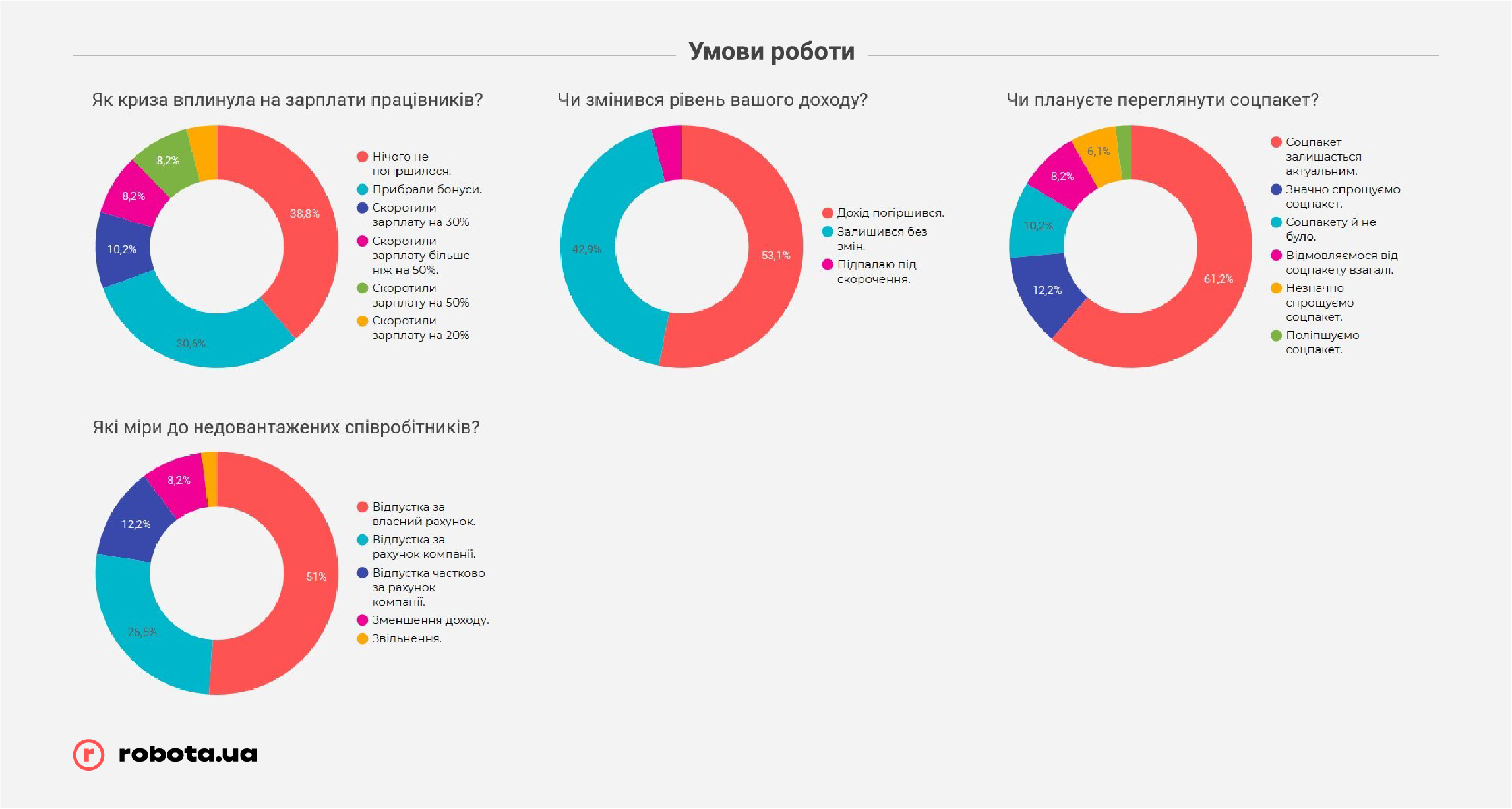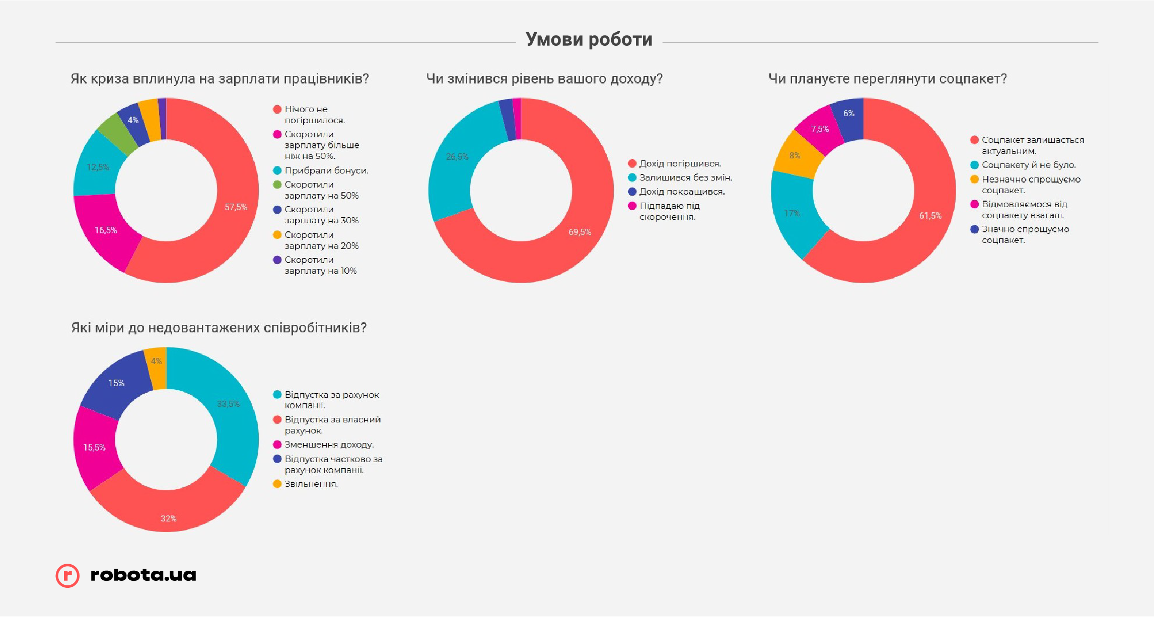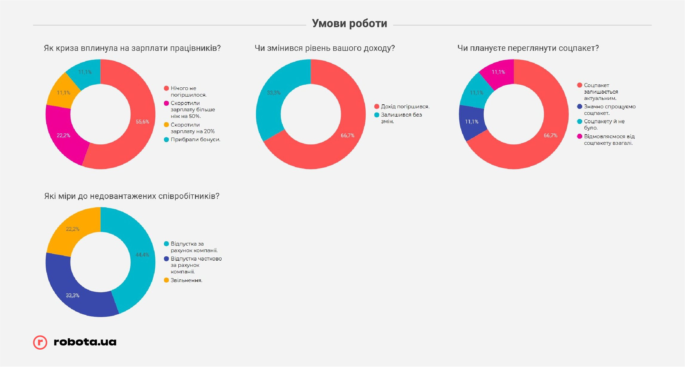 Но не стоит забывать, что robota.ua проводила опрос всего после первого месяца жестких ограничений ведения бизнеса. В случае, если карантин продлится дольше, чем до середины мая, показатели могут быть совсем другими, и гораздо более печальными. К этому времени «запас прочности» закончится у подавляющего большинства малых предприятий и значительной части среднего бизнеса, и тогда они будут вынуждены прибегать к массовым сокращениям, в том числе путем банкротства компаний, так как ресурсов на выплату заработных плат или иных платежей у них уже просто не хватит.