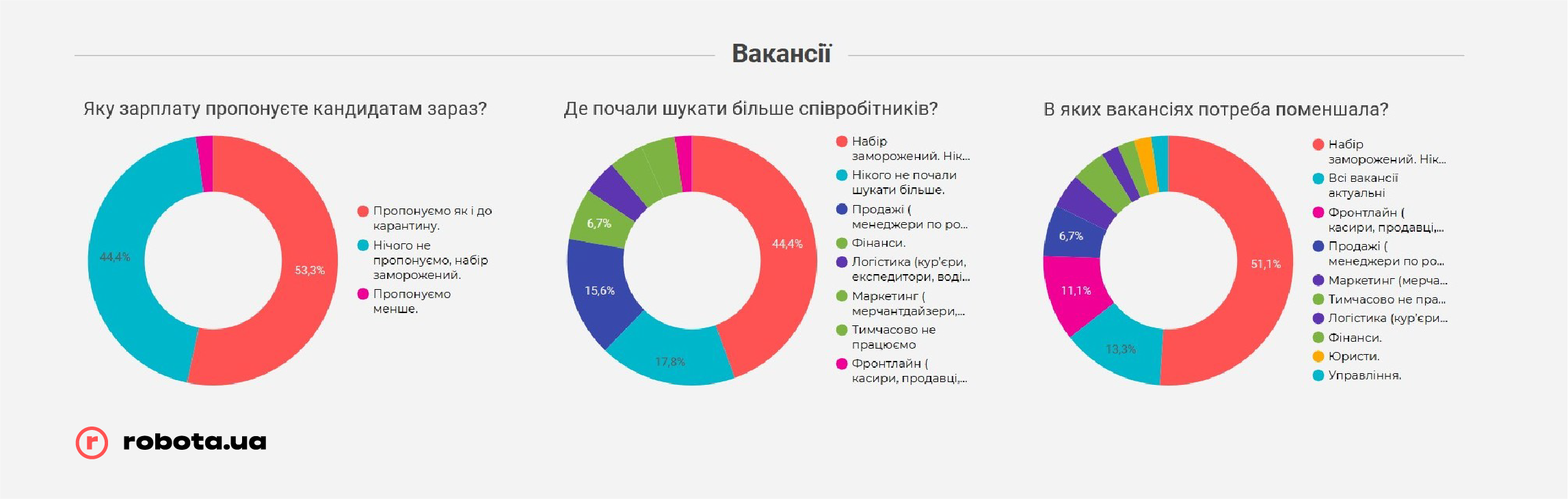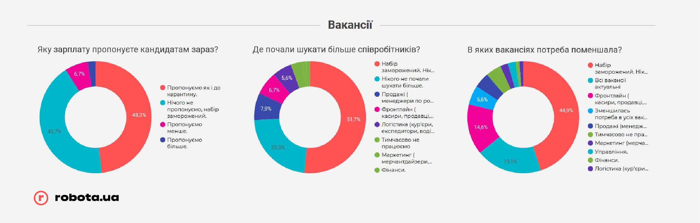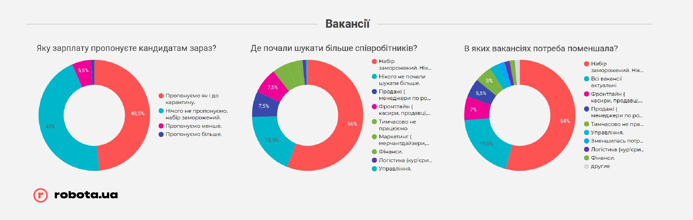 Сложившаяся ситуация немедленно отразилась на рынке труда: менее четверти предприятий оставили открытыми все вакансии или даже открыли новые. Остальные 75% либо заморозили процесс поиска персонала полностью, либо отказались от большей половины вакансий.