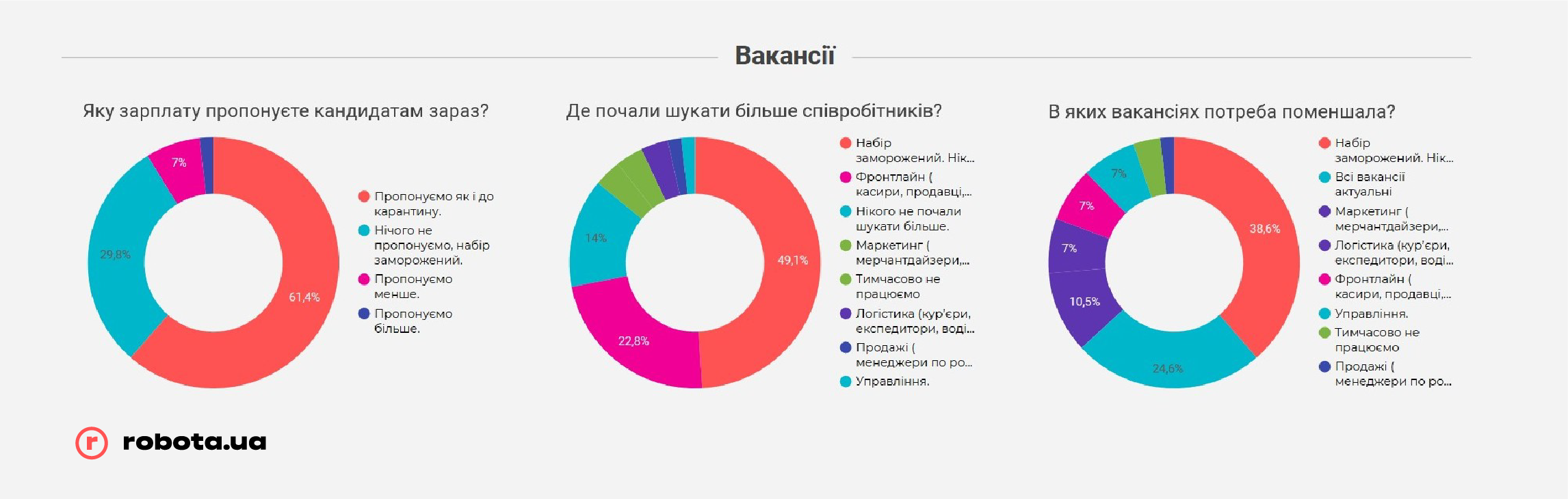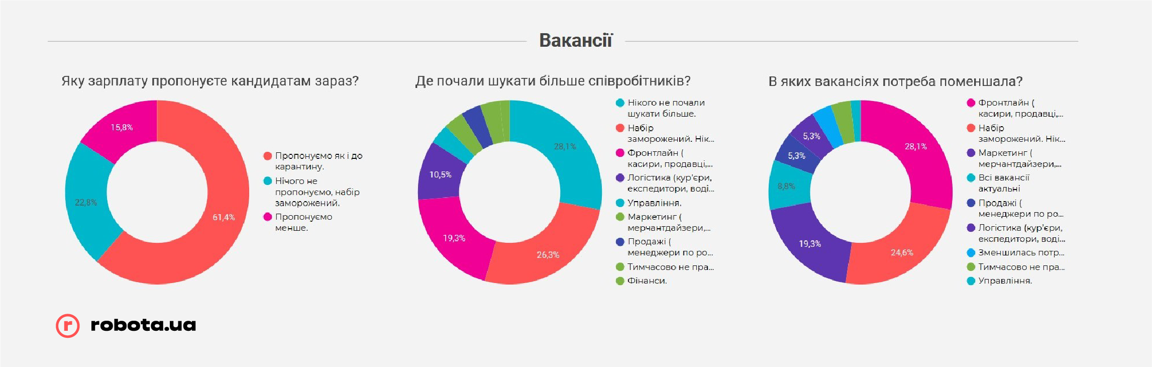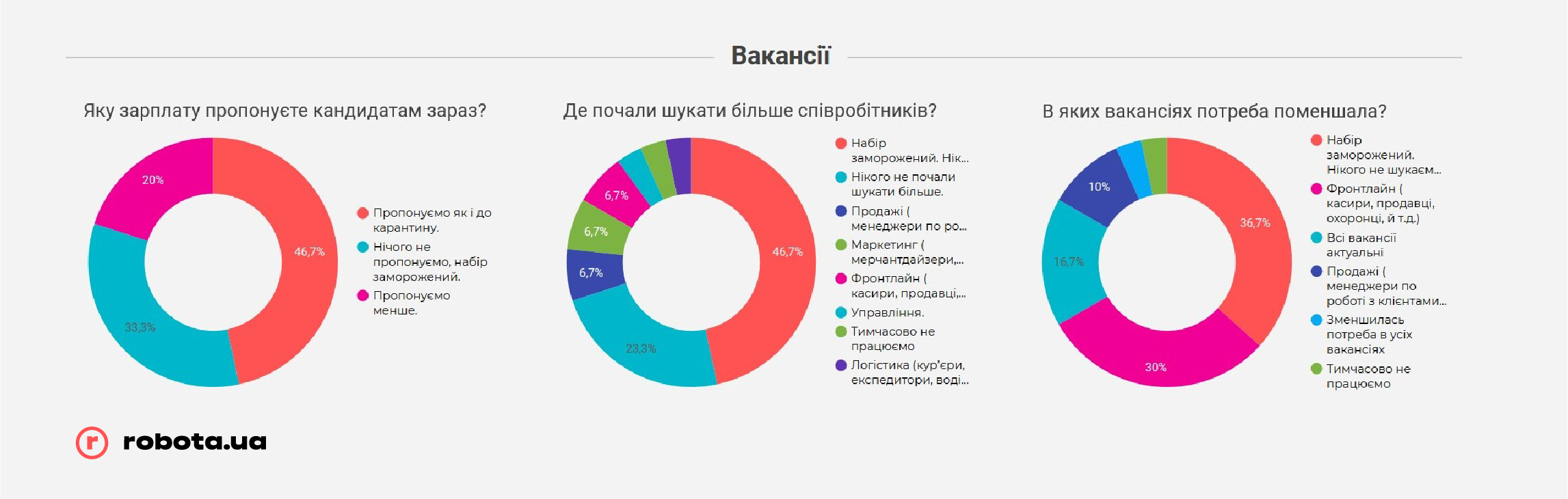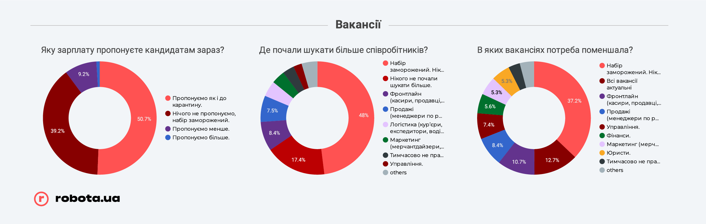 Любопытно, что независимо от размера, предлагаемые зарплаты, несмотря на карантин, остались на том же уровне. Разумеется, у тех предприятий, которые продолжают работать, а не закрыты по решению властей. В каждом случае почти половина компаний сообщили robota.ua, что оставили предлагаемое вознаграждение соискателям на том же уровне, что и до карантина.