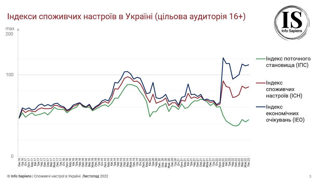 По данным исследования Info Sapiens «Потребительские настроения в Украине», в ноябре 2022 года индекс потребительских настроений (ИДН) составил 85,2 п, что на 1,6 п выше показателя октября. Индекс текущего положения (ИПС) вырос и составляет 44,7, что на 2,3 п выше уровня этого показателя в октябре. Составляющие этого индекса претерпели следующие изменения: