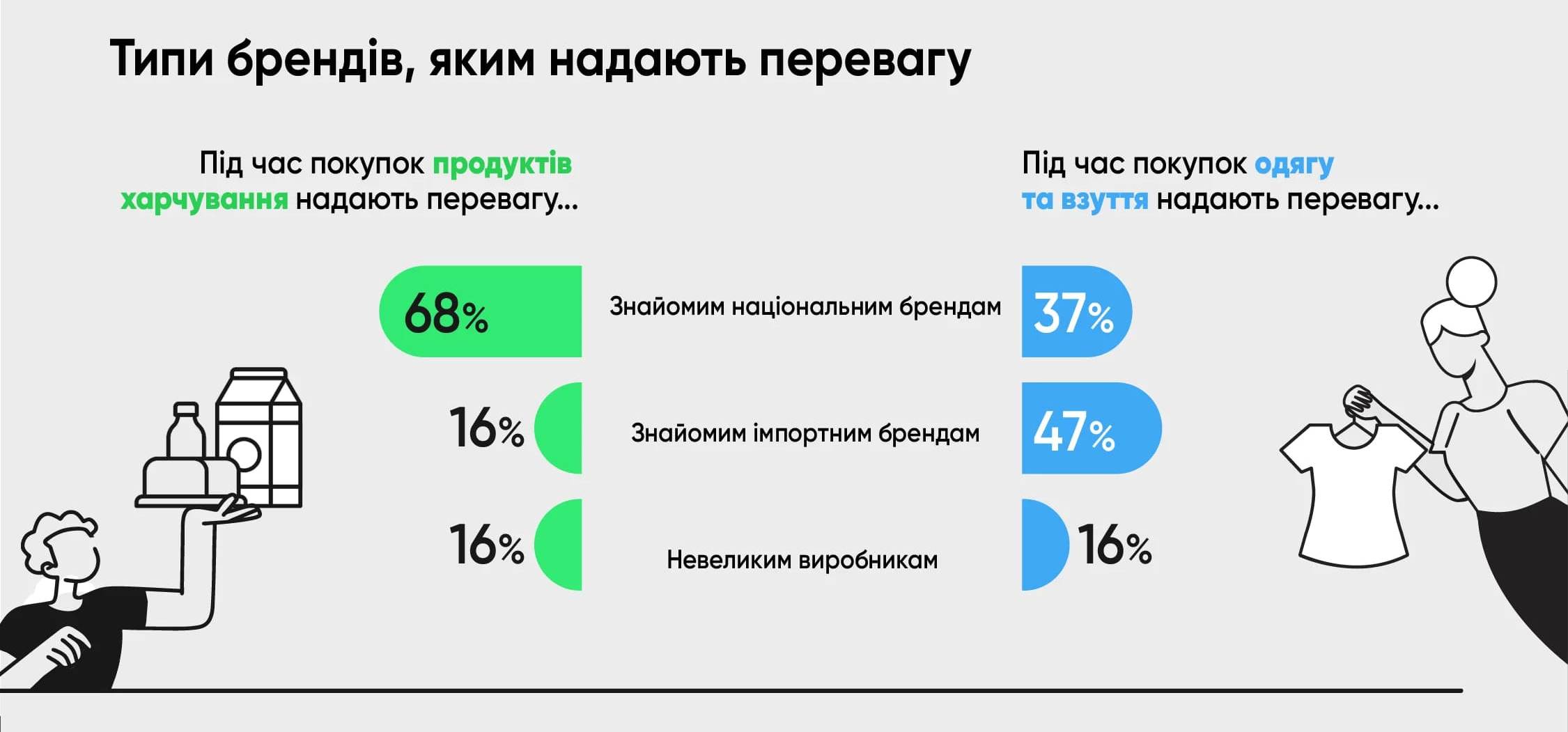 Две основные статьи расходов среди украинцев-это еда/напитки и одежда/обувь. И если национальный производитель пищи занимает ведущее место в продуктовой корзине украинца — 68% отдают предпочтение отечественным брендам; то одежду и обувь все-таки в основном покупают у известных международных брендов — 47%. Но стоит обратить внимание на то, что национальный производитель одежды и обуви уже имеет значительную долю в гардеробе украинцев — более 30% покупают локальные бренды.