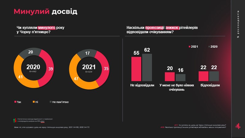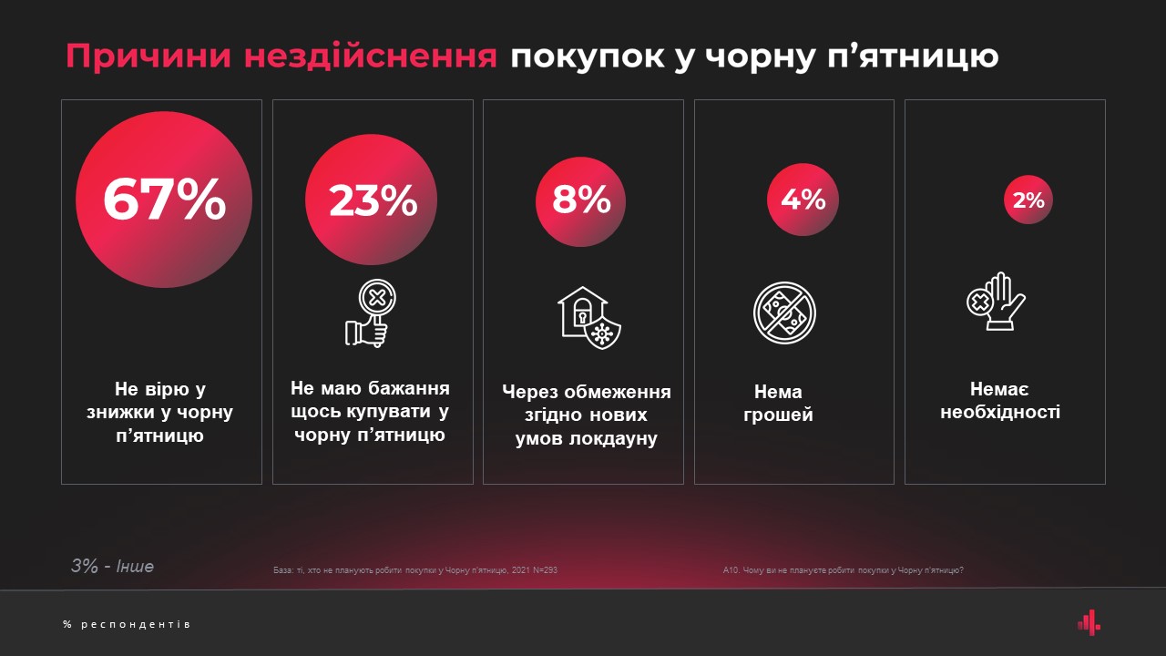 Также, можно отметить, не планируют совершать покупку из-за отсутствия денег в черную пятницу только 4% украинцев, что свидетельствует о покупательной способности большинства потребителей. Бизнесу следует направить энергию на создание положительного опыта покупок в Черную пятницу и минимизировать уровень разочарованности покупателей.