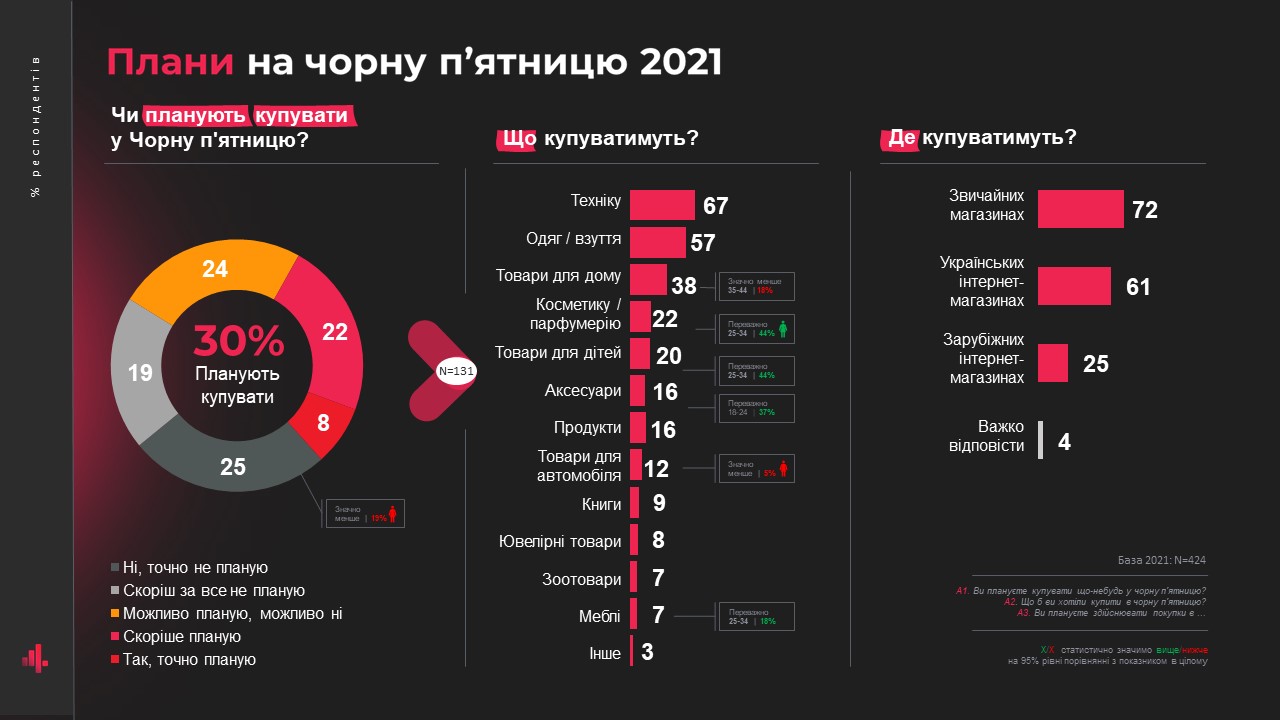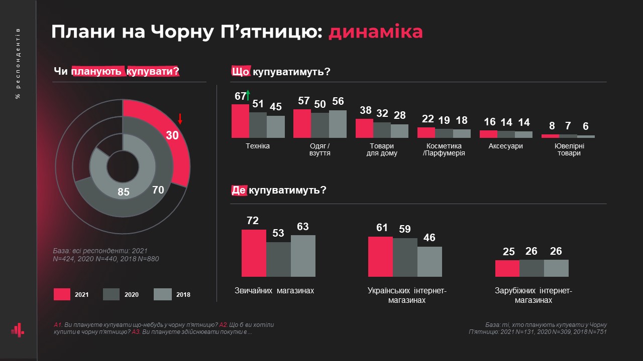 Среди тех, кто планирует совершить покупки в Черную пятницу, вырос процент людей, которые планируют делать это в обычных магазинах. Если в прошлом году украинцы были напуганы пандемией, то в этом году значительный процент потенциальных покупателей обезопасил себя прививками от вируса. Офлайн-покупки стали не только безопаснее, но и комфортнее, ведь из-за усиленного контроля в торговых центрах пока могут находиться не все любители шопинга, а значит, очередей и скоплений будет меньше.