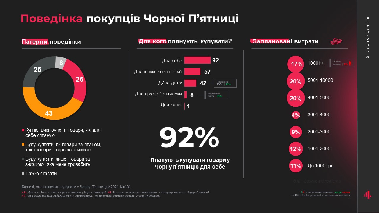 Согласно исследованию, подавляющее большинство опрошенных планирует тратить средства на себя. Часто в ТРЦ потребителя может привести необходимость выбрать подарок для друзей или собрать ребенка в школу, но в Черную пятницу украинцы хотят тратить средства на удовлетворение собственных нужд. 40% респондентов планируют порадовать себя товарами на сумму от 4000 до 10 000 гривен.