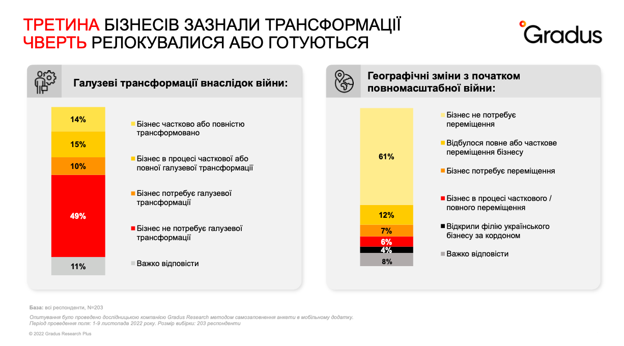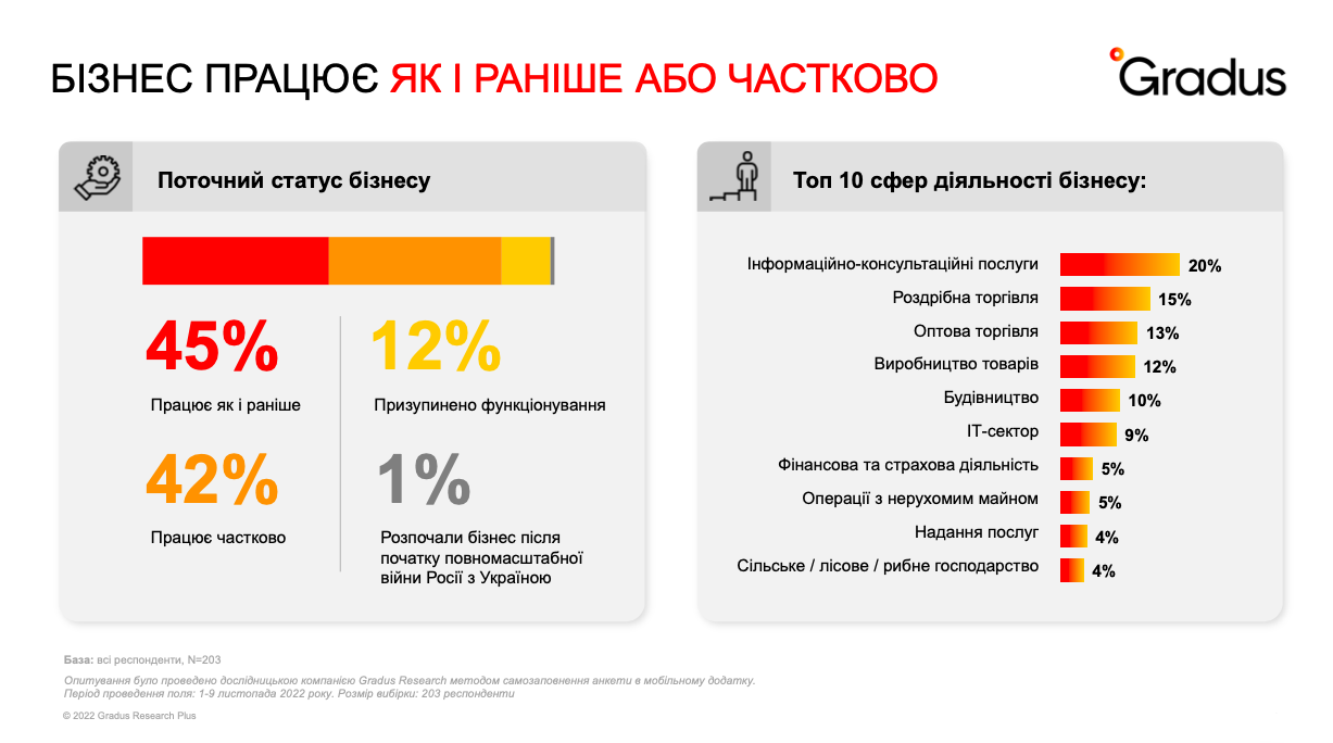 Исследовательская компания Gradus Research представила данные: в каком формате сегодня работает украинский бизнес, какие уроки извлекает из войны и когда ожидает завершение активных боевых действий в Украине.