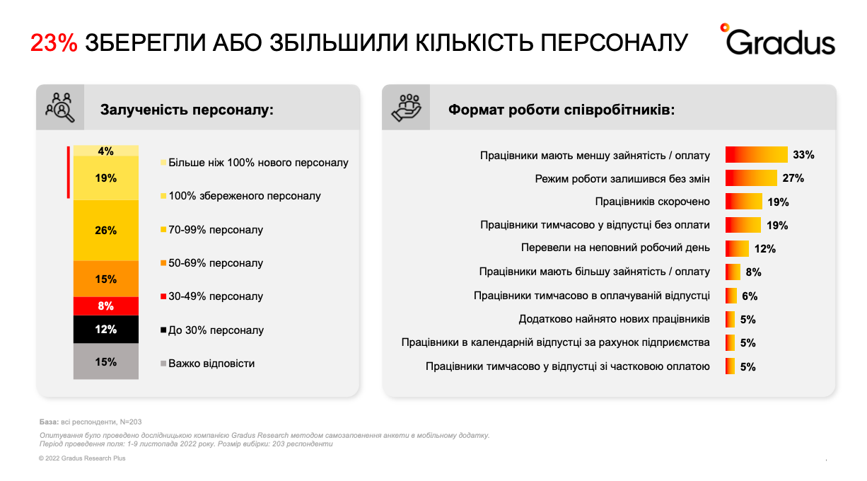 23% компаний остаются с довоенным количеством персонала или приумножили его. Однако почти такая же доля – 26% компаний должны были сократить свои команды до трети. При этом преимущественно работники имеют меньшую занятость и меньшую оплату (33%) – поскольку это один из механизмов как сохранить всех людей в компании.