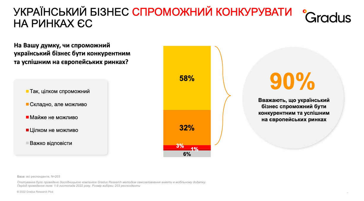 Подавляющее большинство, или 90% предпринимателей, считают, что украинский бизнес способен быть конкурентным и успешным на европейских рынках.