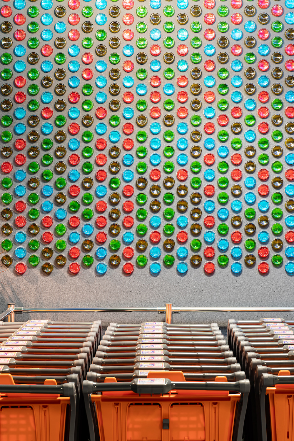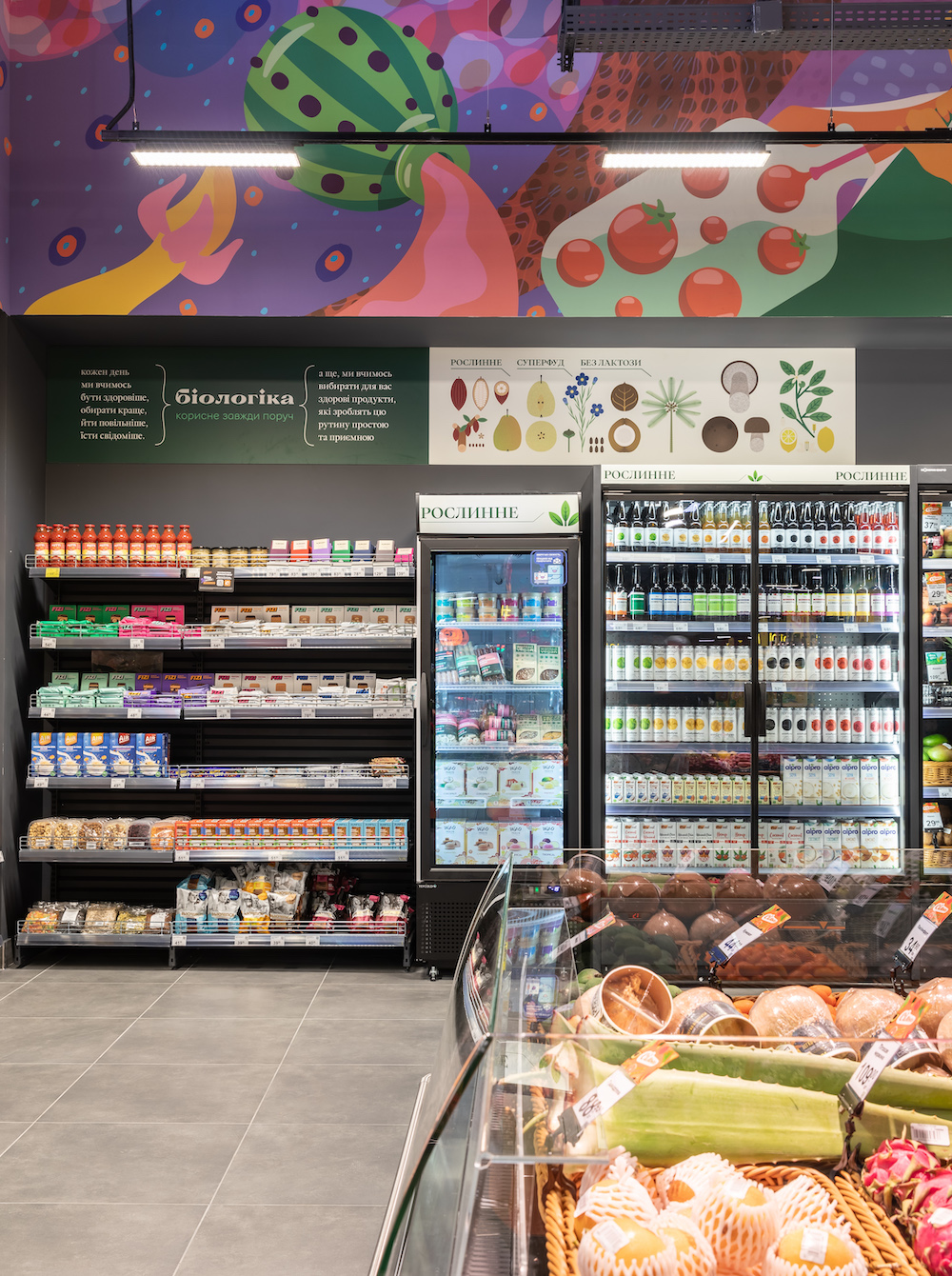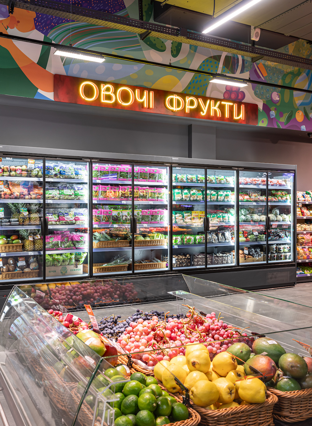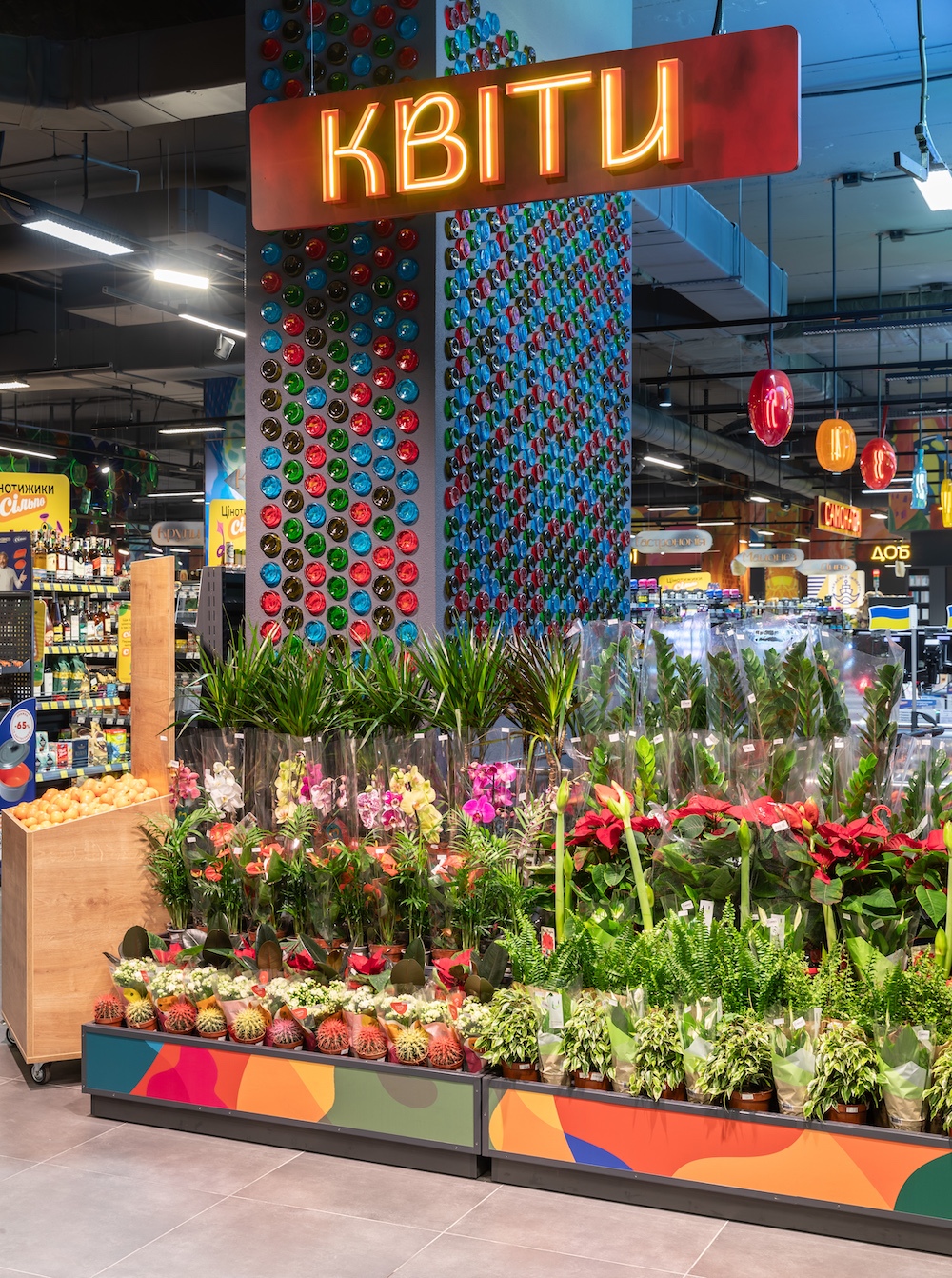 Новый супермаркет сети Сільпо стал центром искусства стеклодувов, чтобы во время похода за вкусненьким гостей сопровождала игра цветов и света. Знакомство начинается с игривых полос света в витраже на входе.