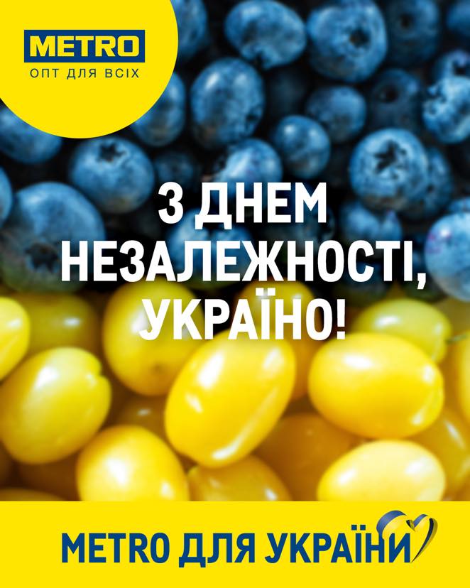 Немецкая сеть Metro Cash&Carry подготовила большую содержательную речь. “31-й День Независимости Украины особенный. Мы всегда ценили свободу, человеческие ценности, возможность выбирать собственный путь. И именно в этом году нам пришлось защищать свою независимость в бою. Мы точно знаем, что Украина невероятная, ведь вместе со смелыми личностями и мощными культурными сообществами есть современные диджитализированные государственные услуги и успешные стартапы, и теперь об этом знает весь мир.в году мы убедились, что вместе можем все! Не только помогать и делиться друг с другом, но покупать хоть беспилотники, хоть спутники. Мы способны на невероятные вещи для сохранения наших ценностей. Украина невероятная. Наш народ непобедим. «У смелых всегда есть счастье», поэтому победа за нами. Боремся – поборем! Metro из Украины, для украинцев”, – приветствовали в компании.