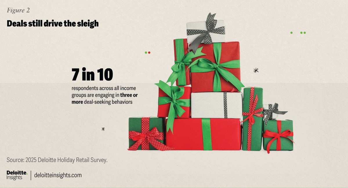 Согласно данным исследования Deloitte о розничной торговле в праздничный период 2025 года, покупатели, спасаясь от экономической неопределенности, обращаются к скидкам, цифровым удобствам и сезонным мероприятиям, чтобы сохранить хорошее настроение.