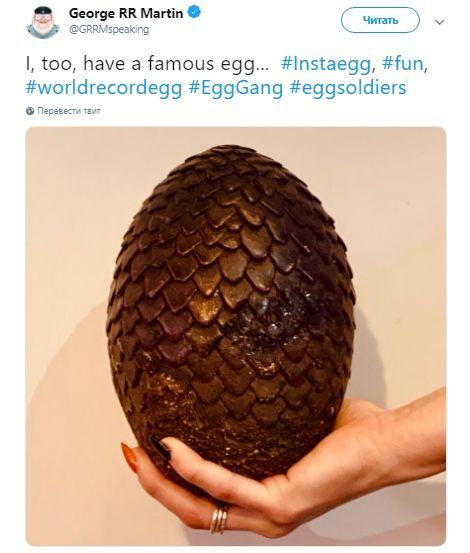 Поддержал баттл мемов даже 70-летний автор серии романов “Игры престолов” Джордж Мартин, который похвастался своим «драконьим яйцом» в Twitter.