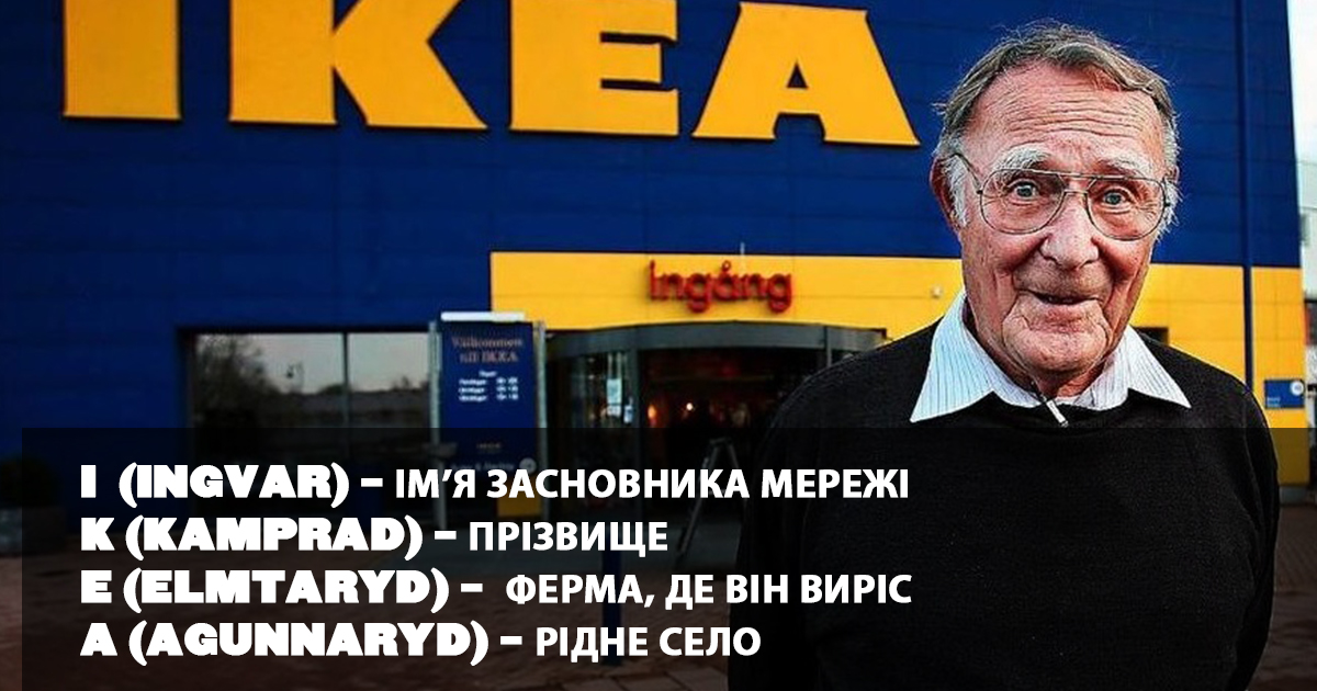 Название гипермаркетов IKEA неспроста обычно пишут большими буквами, ведь IKEA – это аббревиатура. Причем незаурядная. Основатель компании Ингвар Кампрад вложил в ее название максимум аутентичности. Он взял свои инициалы, I. K. и добавил в них первые буквы названий фермы и деревни, в которых он вырос – Elmtaryd и Agunnaryd. Расшифровывать это название смысла нет – его и сложно будет произнести, но этого и давно нет смысла делать – мировой гигант давно всем все доказал.