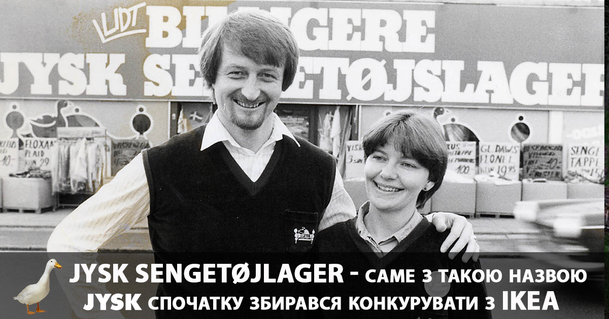 Датская сеть JYSK берет свое начало с 70-х годов XX века. Тогда находчивый молодой человек, основатель сети Ларс Ларсен решил открыть собственную сеть розничных магазинов по распродаже постельного белья. Однако первые магазины сети имели название Jysk Sengetøjlager (”Ютландский склад постельного белья”) – привычное словосочетание для датчанина, однако неописуемое для иностранцев. Впоследствии его сократили до слова JYSK, что означает принадлежность кого-то или чего-то к ютландскому полуострову, а также можно перевести с датского языка, как «гусь». Именно поэтому уже около 50 лет гуся можно увидеть на логотипе компании. Первый магазин JYSK в датском городе Орхус был открыт 2-го апреля 1979 года, он до сих пор на месте, и до сих пор функционирует.