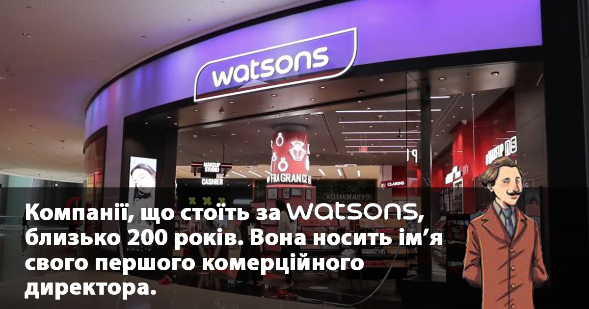 Как не сложно догадаться, сеть магазинов Watsons назвали в честь человека, однако, как оказывается, не основателя. Да и с украинским названием сети не так все просто. Дело в том, что международная компания называется AS Watson Group, которая берет свое начало из небольшой амбулатории, открытой в далеком 1828 году в Китае. Она предоставляла бесплатные медицинские консультации и продавала газировку. В 1858 году к совладельцам Александру Андерсону и Питеру Янгу в качестве менеджера присоединился британский фармацевт Александр Скирвинг Уотсон, который стал ее первым коммерческим директором. Именно с этого времени компания начала стремительное развитие и позже получили его имя в названии. Что касается украинской сети, то она начинала работать под брендом “ДЦ” и лишь после того, как стала частью международной корпорации A.S. Watson Groupe, в 2011-м была переименована в Watsons – то есть “та, что принадлежит Уотсону”.
