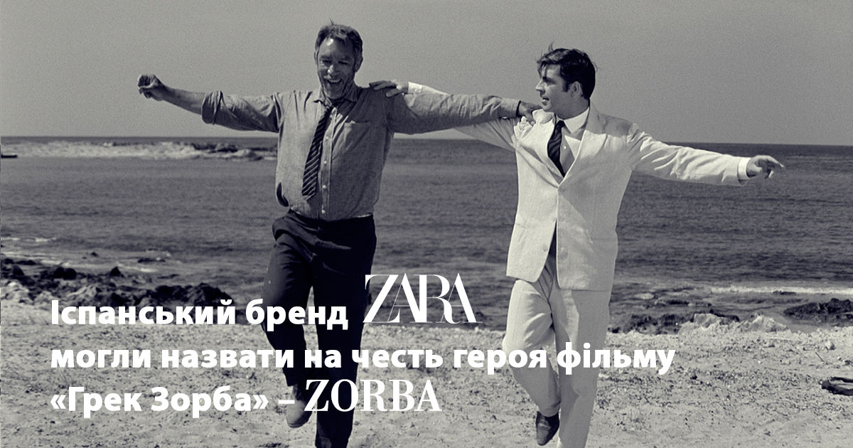 Свой первый магазин Омансио Ортега и его партнер по бизнесу Росалия Мэра открыли в 1975-м в испанском городе Ла-Корунья. Сначала они хотели назвать магазин Zorba в честь своего любимого героя из фильма «Грек Зорба» режиссера Никоса Казандзакиса. Но рядом с магазином открылся бар с таким же названием, Так что партнерам пришлось искать выход из положения. Далеко решили не ходить и придумать название, в котором сохранено как можно больше букв из желаемого слова, поэтому остановились на Zara.