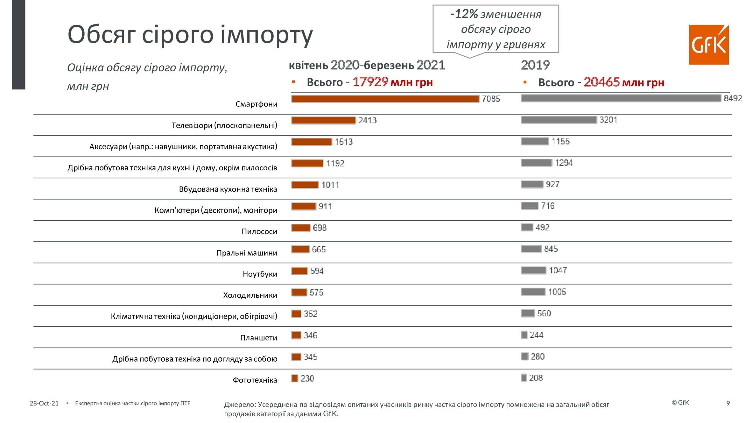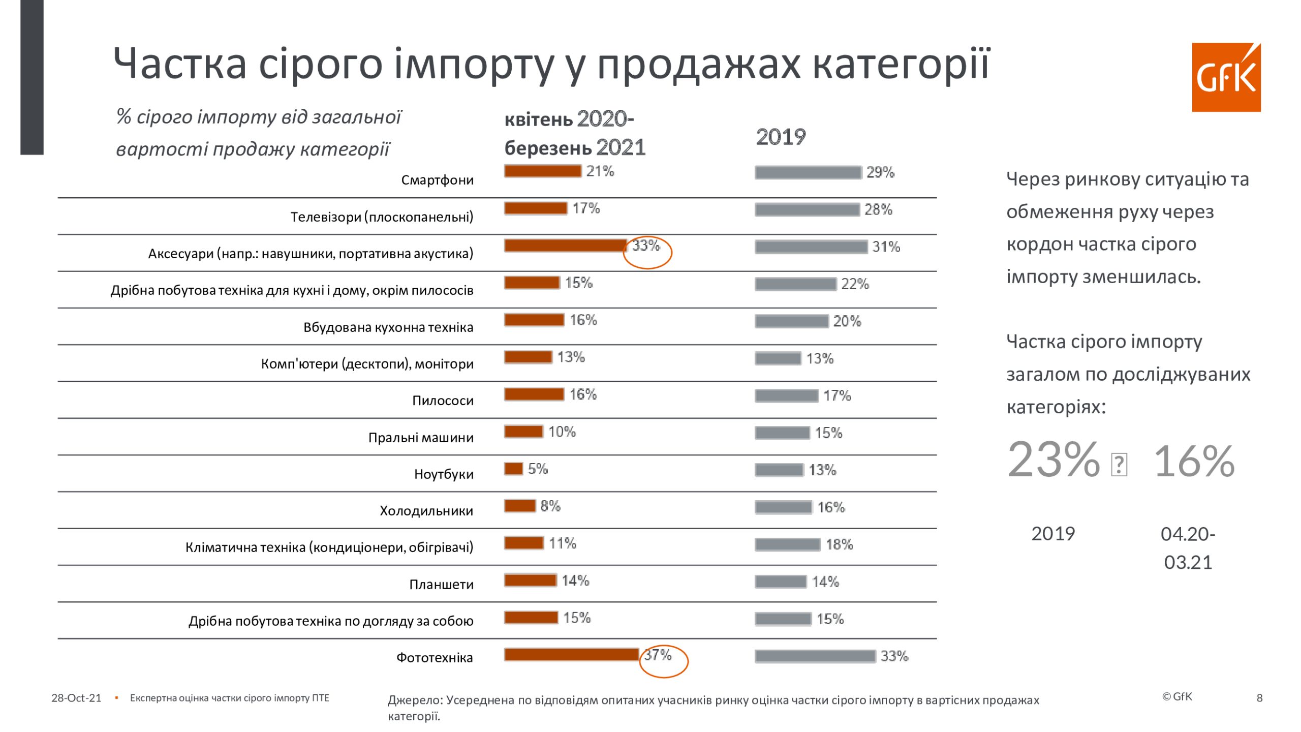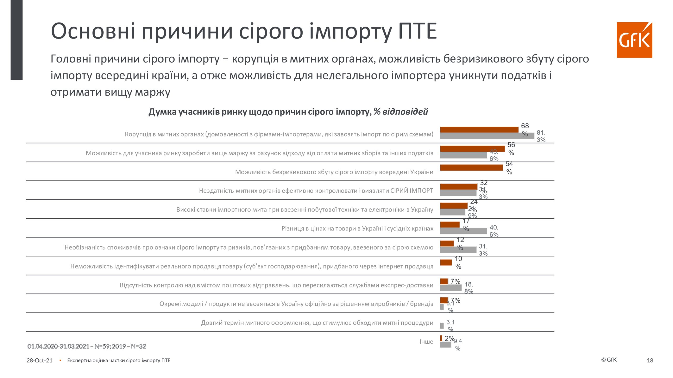 По инициативе Европейской бизнес-ассоциации, Ассоциации «Украинские импортеры бытовой электроники» и GfK был проведен экспертный опрос участников рынка о доле и тенденциях «серого» импорта бытовой техники и электроники в Украину в период с апреля 2020 года по март 2021 года. Анкета содержала вопрос о 14-ти продуктовых группах, на продажи которых приходится 80% общих продаж бытовой техники и электроники. В экспертном опросе приняли участие представители компаний-производителей бытовой техники и электроники, импортеров, дистрибьюторов и розничных сетей (в основном, это – категорийные менеджеры, коммерческие директора и руководители компаний).