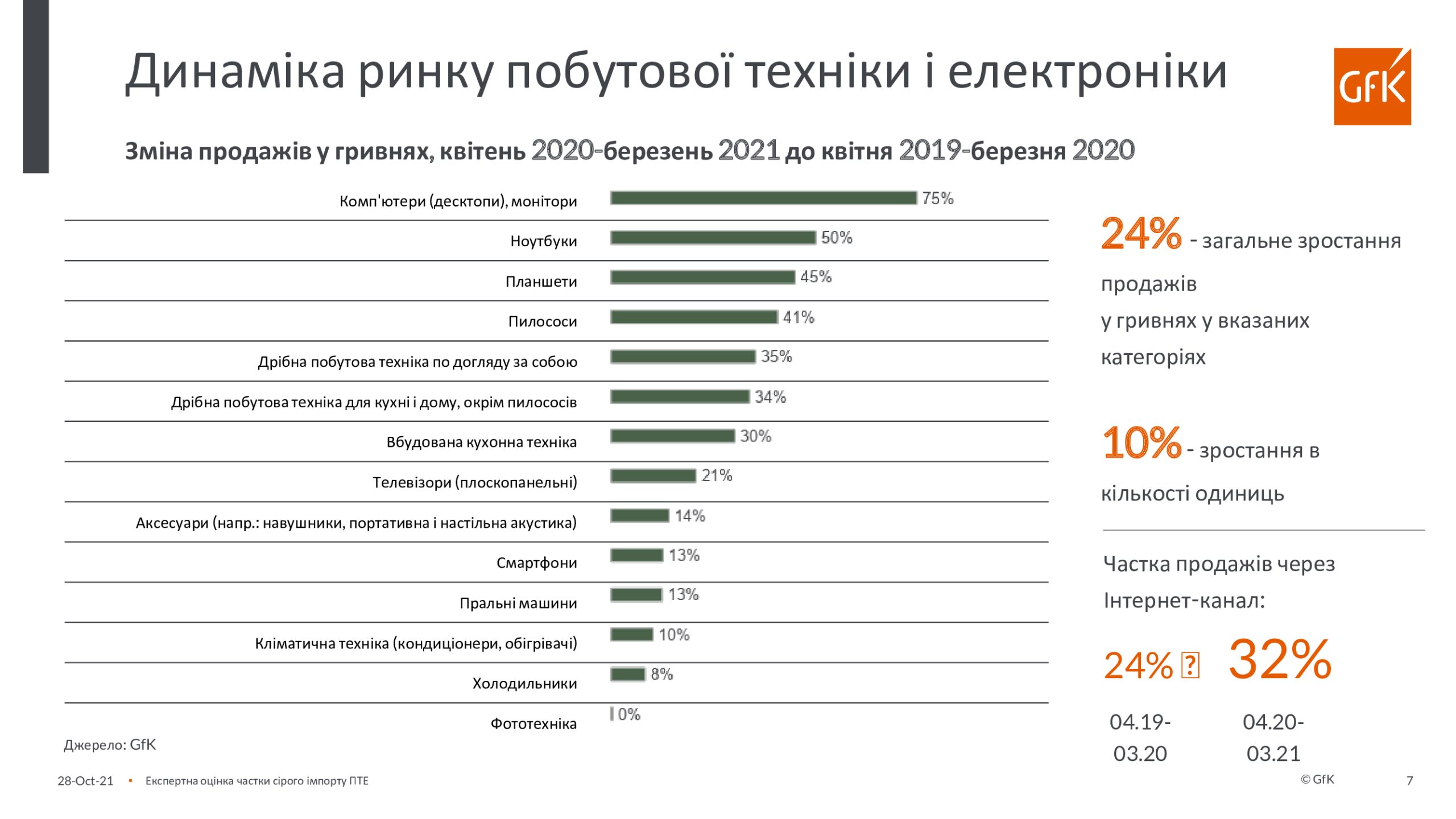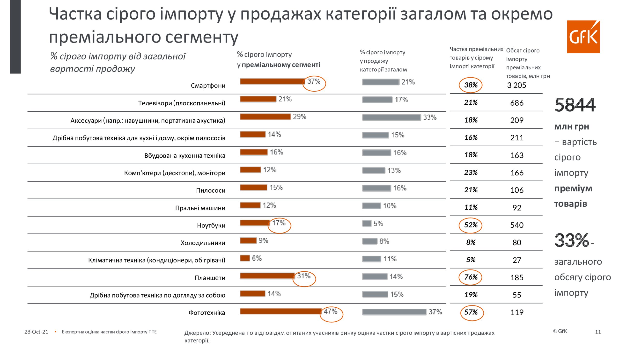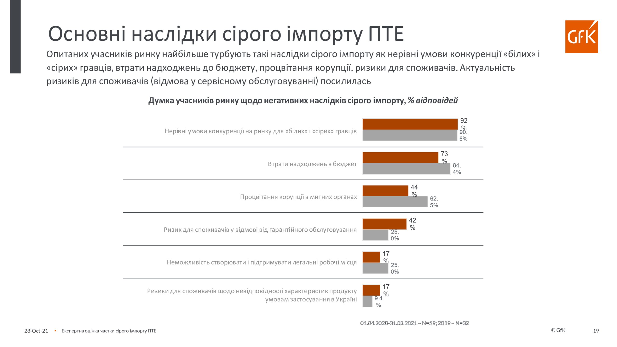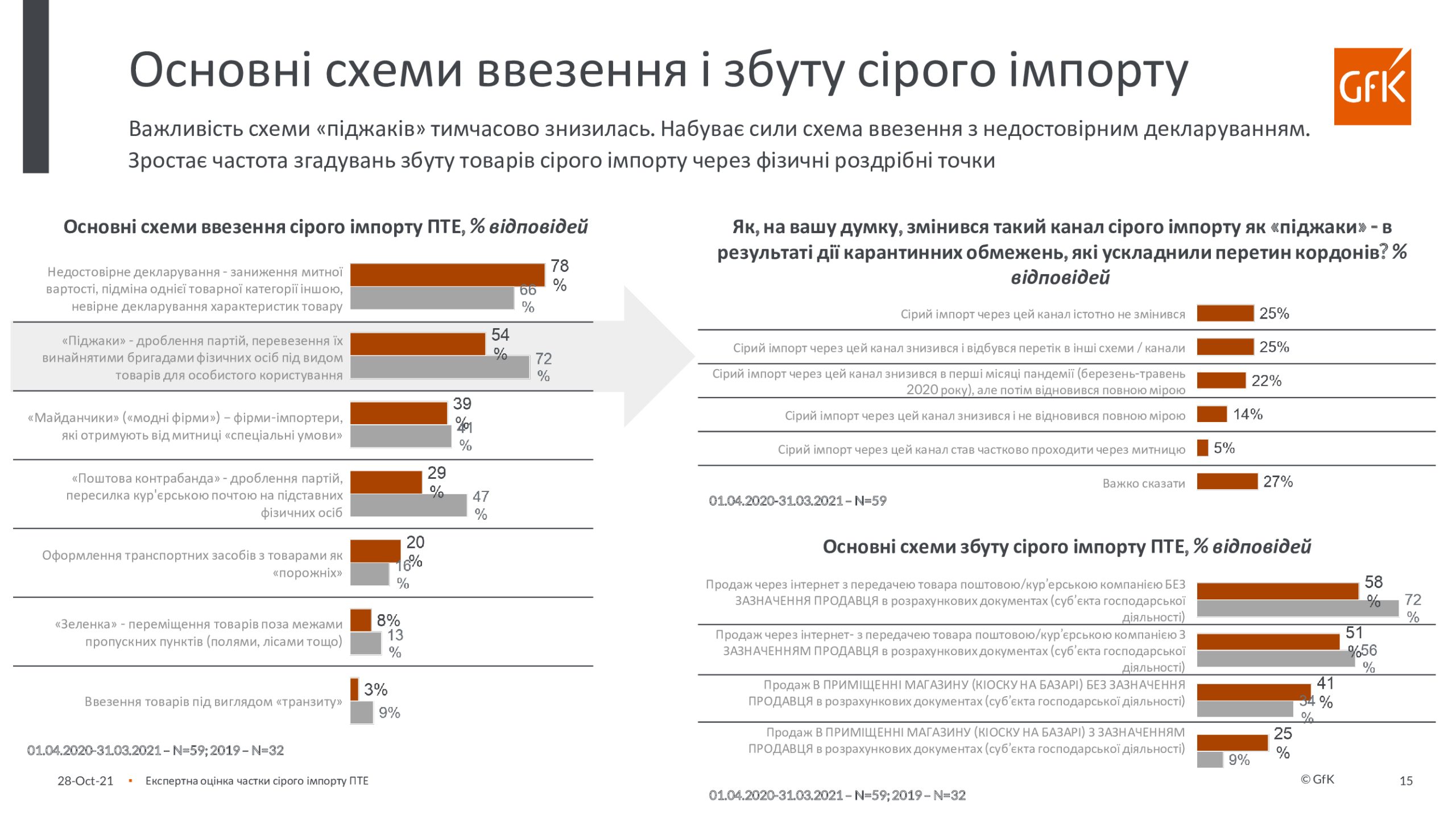 По инициативе Европейской бизнес-ассоциации, Ассоциации «Украинские импортеры бытовой электроники» и GfK был проведен экспертный опрос участников рынка о доле и тенденциях «серого» импорта бытовой техники и электроники в Украину в период с апреля 2020 года по март 2021 года. Анкета содержала вопрос о 14-ти продуктовых группах, на продажи которых приходится 80% общих продаж бытовой техники и электроники. В экспертном опросе приняли участие представители компаний-производителей бытовой техники и электроники, импортеров, дистрибьюторов и розничных сетей (в основном, это – категорийные менеджеры, коммерческие директора и руководители компаний).