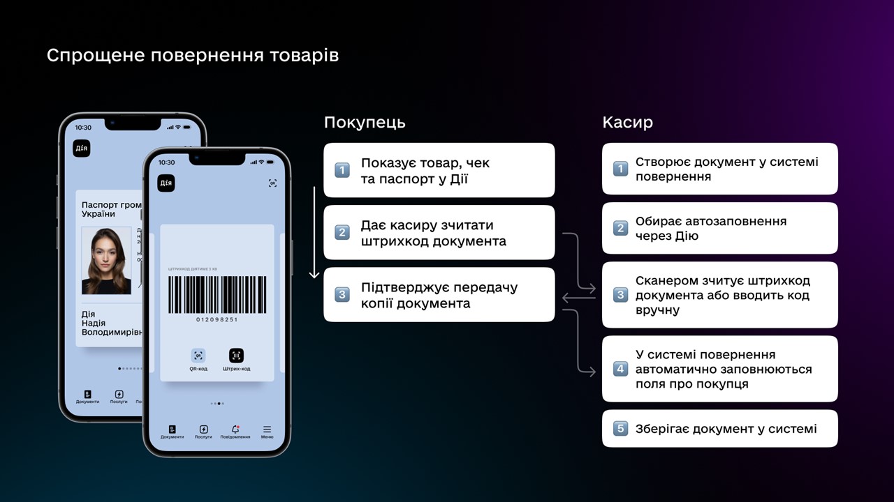 Следующим этапом стало внедрение бизнес-процесса возврата товара клиентом. Раньше покупателю нужно было заполнять печатную форму заявления на возврат, в которую он вручную вносил свои персональные данные, после чего наш сотрудник должен был всю эту информацию перенести в учетную систему. Такой процесс не был удобен, поэтому мы благодаря шерингу Дії его упростили. Теперь оформление возврата в нашей сети работает следующим образом: когда покупатель обращается в магазин для возврата товара, наш сотрудник сканирует штрихкод документа из Дії клиента, а покупателю остается только подтвердить передачу данных.