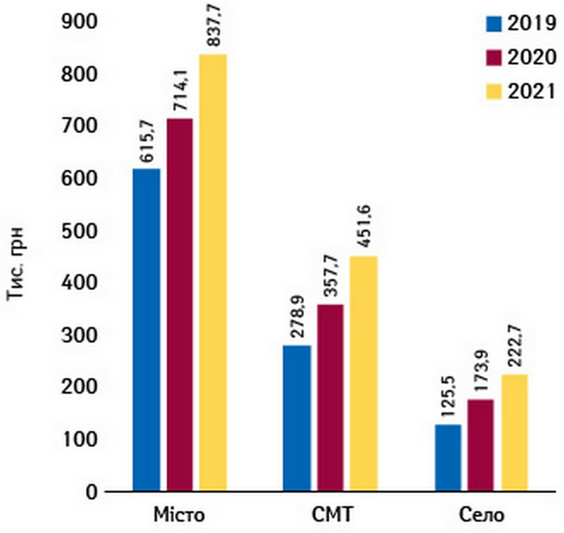 Конечно, уровень средней выручки отличается в зависимости от типа населенного пункта, в котором расположено аптечное учреждение. Так, в городах средняя выручка составляет 837 700 грн, для пгт – 451 600 грн и для села – 222 700 грн. Чем больше население и более высокий уровень доходов, тем значительнее сумма. Однако, как видно на диаграмме, этот показатель постоянно растет во всех типах населенных пунктов.