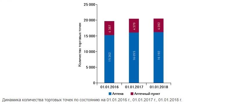 Инфраструктура украинского аптечного рынка постоянно меняется. Количество торговых точек постепенно увеличивается, в основном за счет открытия аптек при сокращении числа аптечных пунктов. За последние три года количество торговых точек в аптечной рознице увеличилось на 825 единиц. По состоянию на начало 2018 года в Украине функционировало 16 200 аптек и 4 300 аптечных пунктов (соотношение аптек и аптечных пунктов составляет 79% на 21%). Всего в стране насчитывается 20 500 торговых точек. В среднем на одну торговую точку приходится около 2 000 жителей.